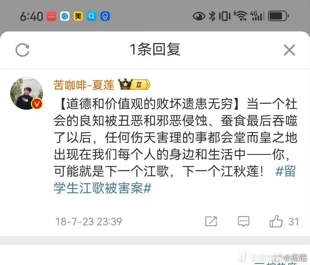 江秋莲女士曾掷地有声的谈及道德: “道德和价值观的败坏遗患无穷,当一个社会的良知被丑恶和邪恶侵蚀,蚕食最后吞噬了以后,任何伤天害理的事都会堂而皇之出现在我们每个人身边和生活中。你可能就是下一个江歌,下一个江秋莲。”