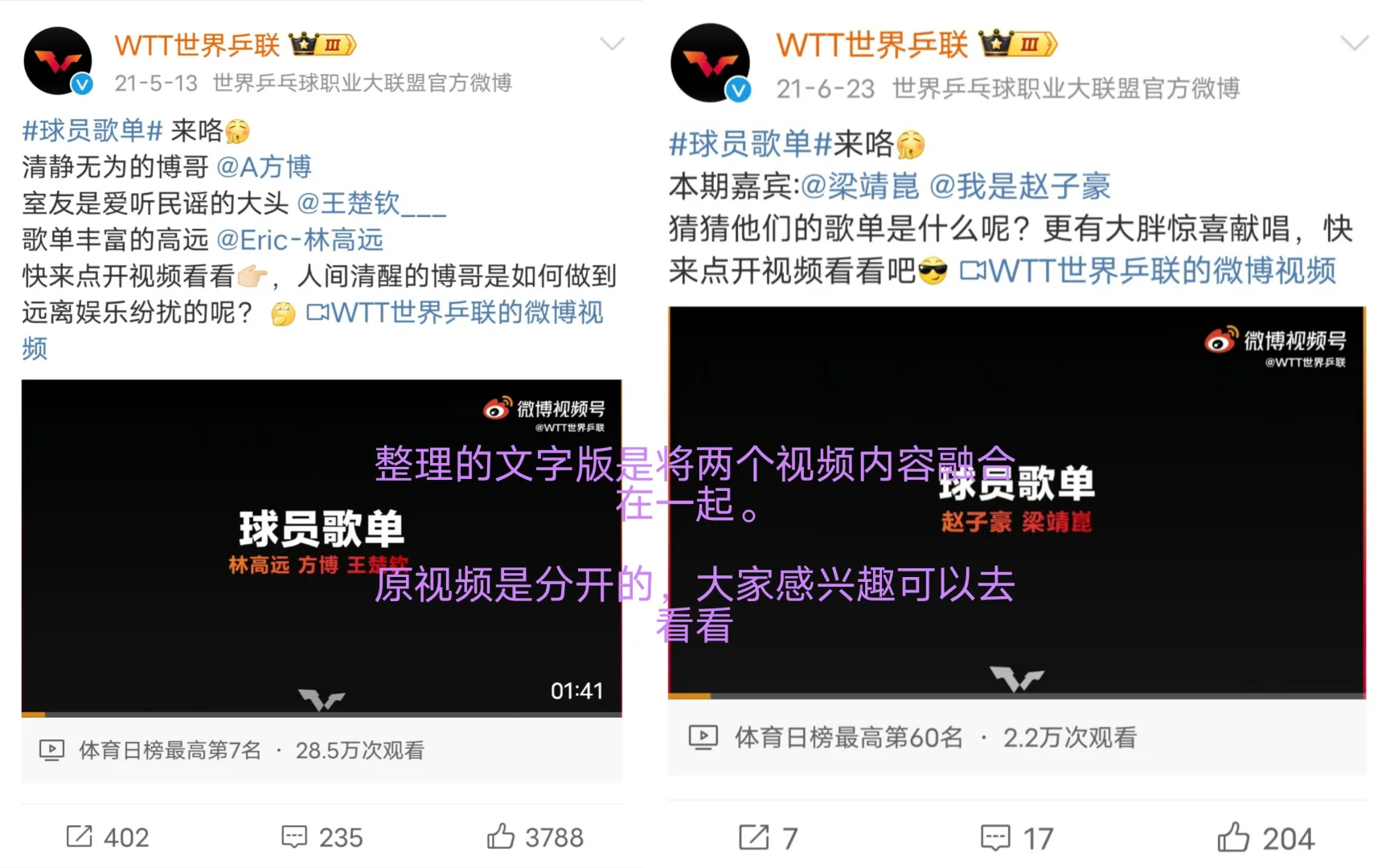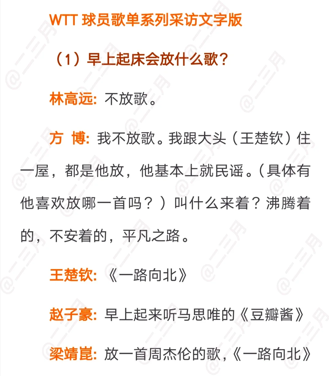 WTT球员歌单系列问答采访,找到了两个相关视频,把视频里的文字整理出来了,希望大家能够了解不一样的他们
