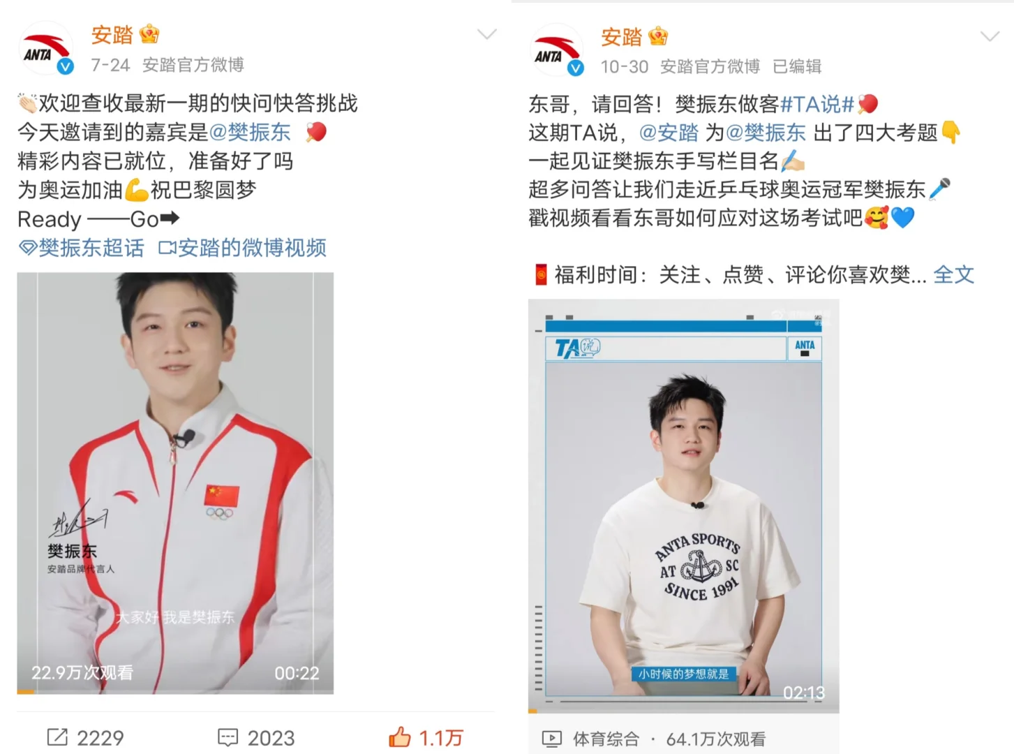 两个都是安踏发的,视频里的樊振东真的好帅啊!!!