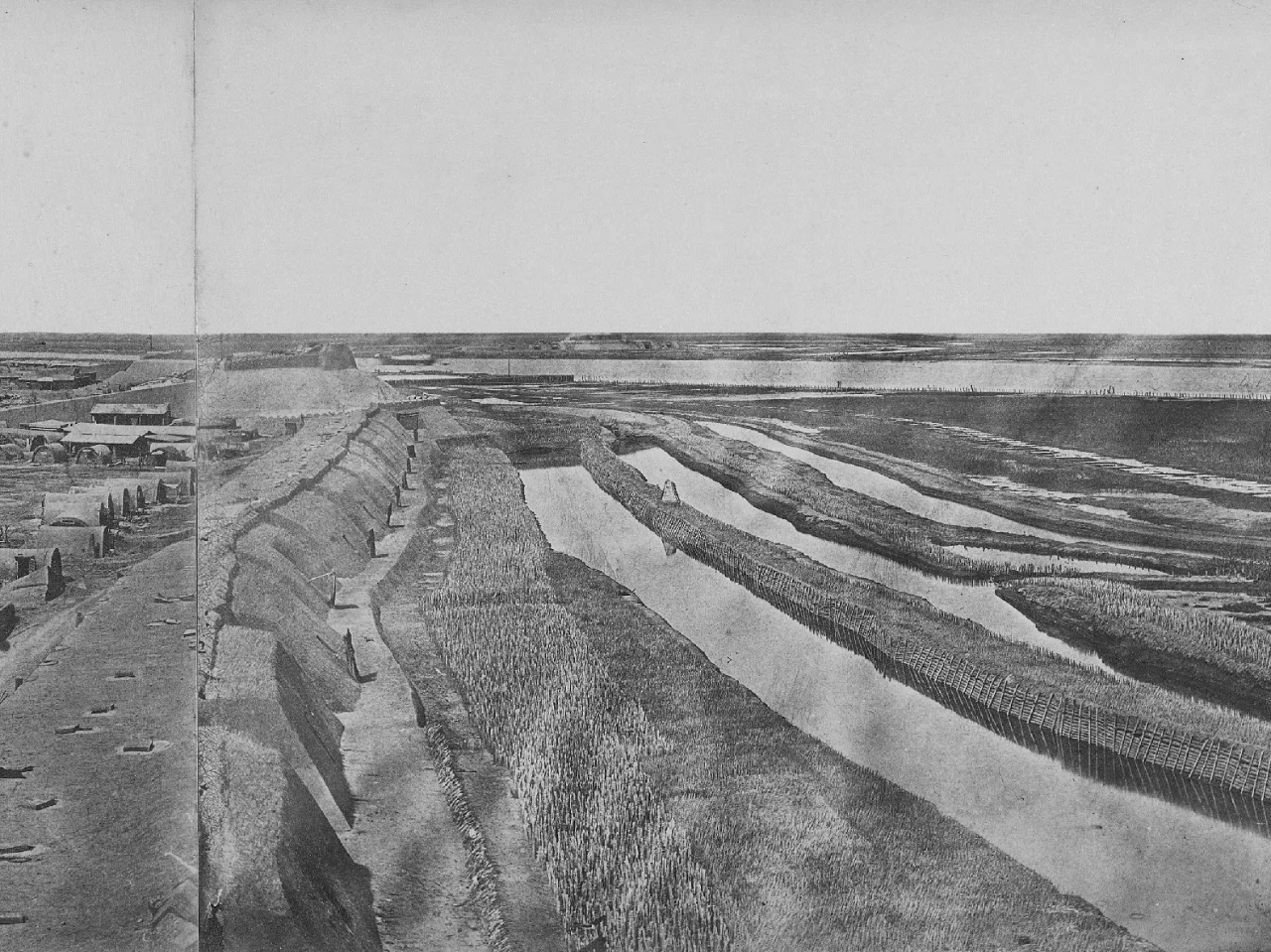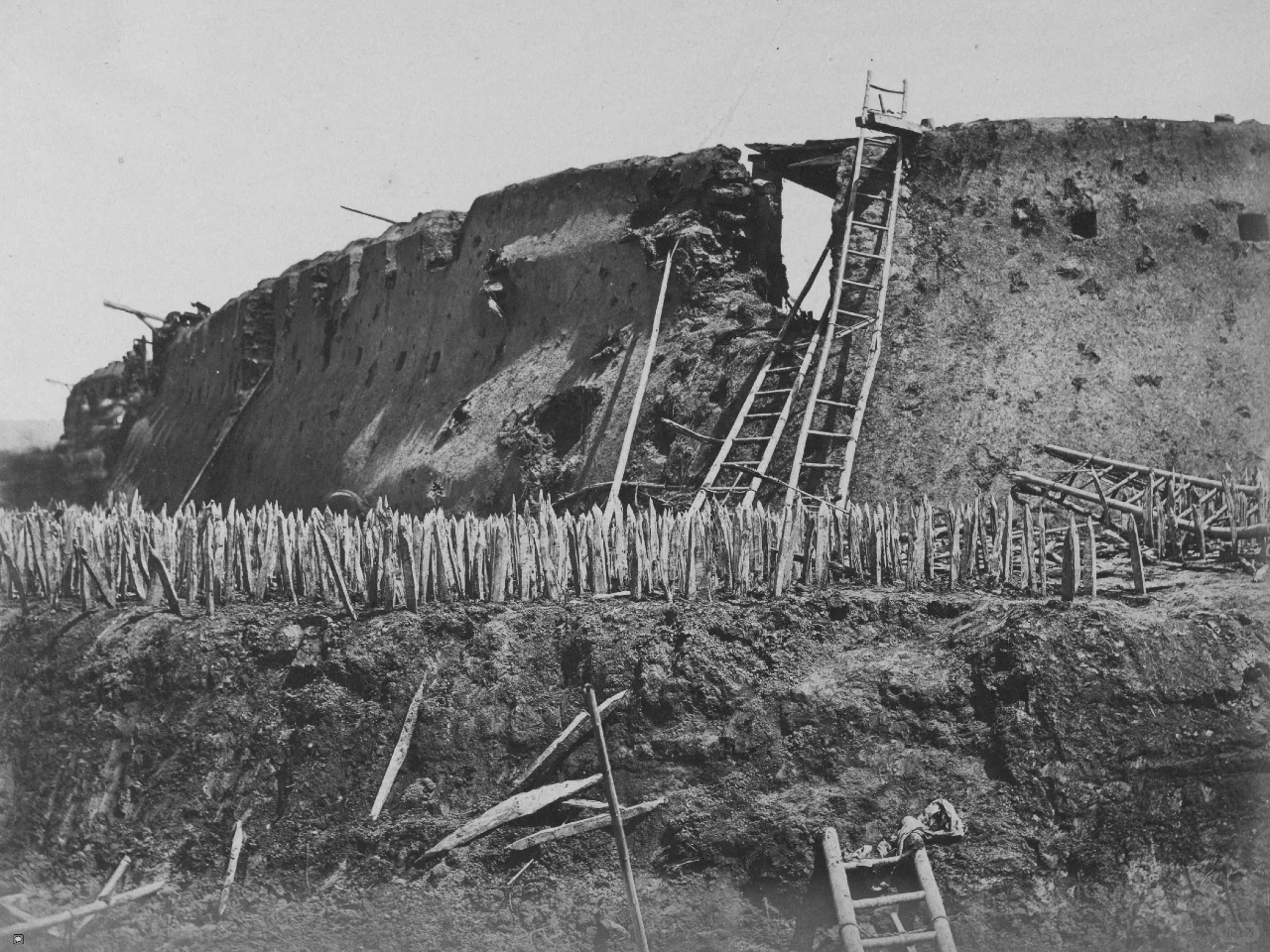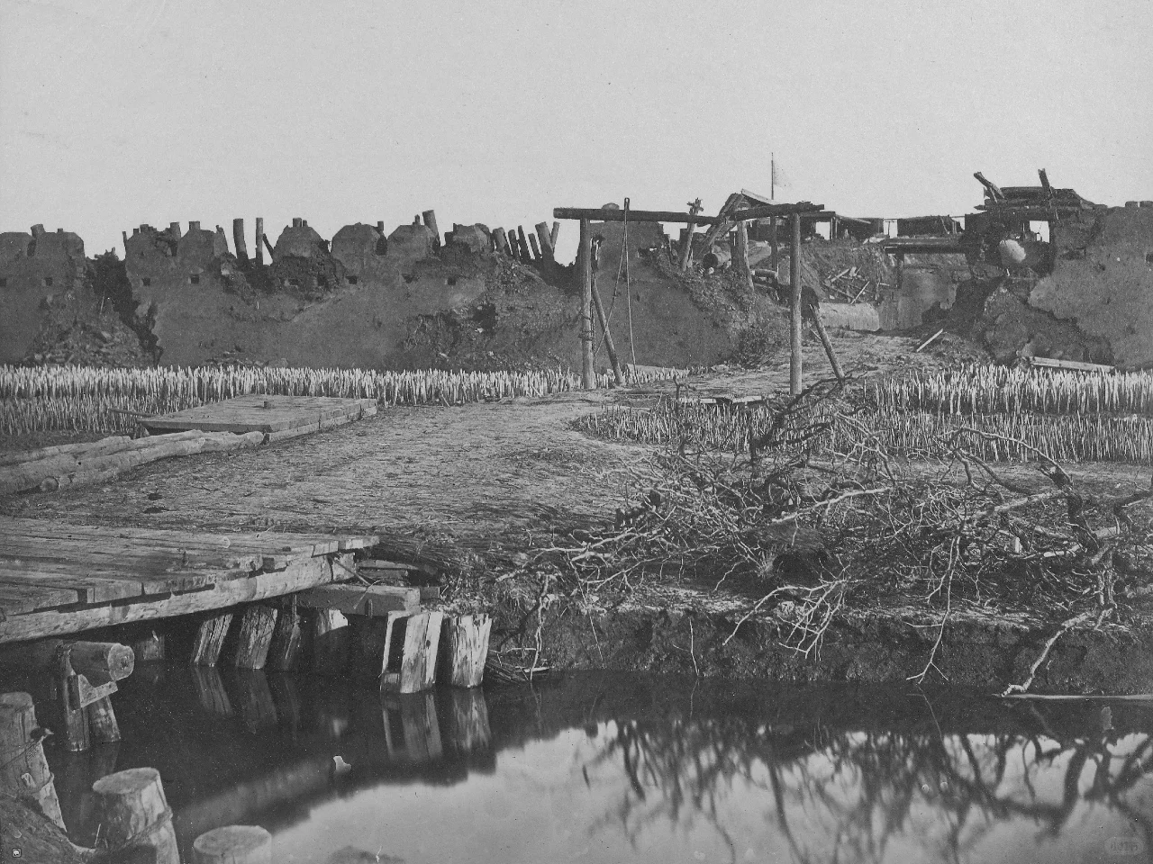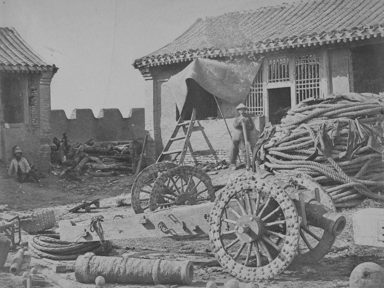 [私信R]图为1860年联军攻陷大沽口炮台后由早期战地摄影记者费利斯·比托拍摄的照片,其中可以看到联军的军舰和架设的梯子、炮台的外壕沟和木刺、落后的火炮、甚至有些照片里还可以看到清军使用的弓弩。他后随英法联军在中国境内拍摄了大量珍贵的影像。