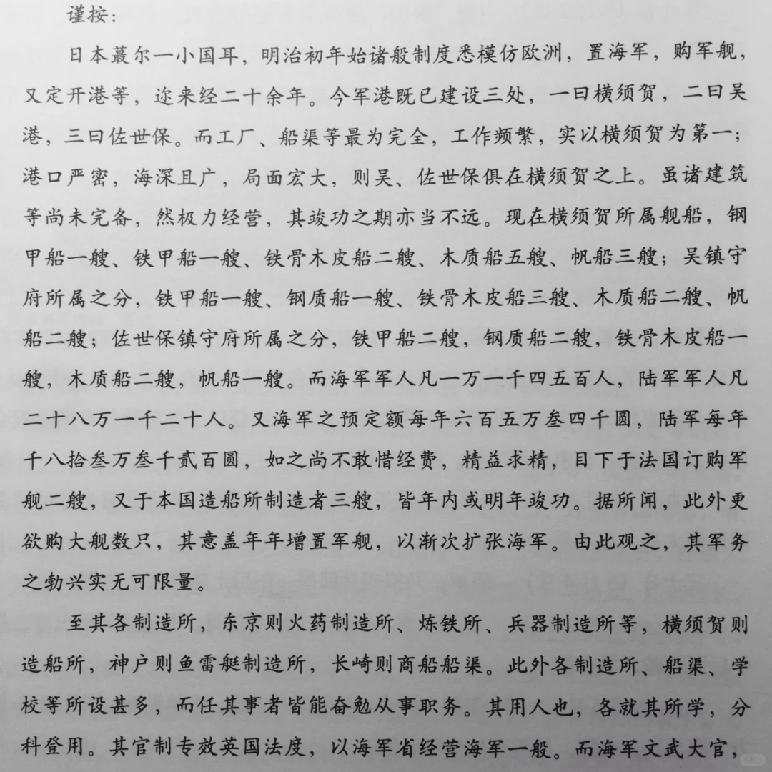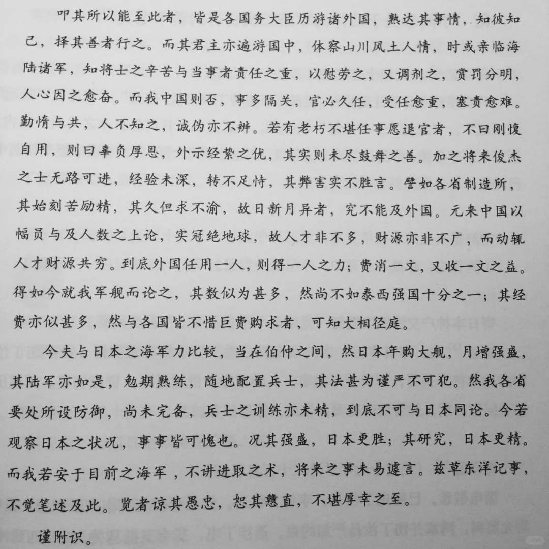 “今夫与日本之海军比较,当在伯仲之间,然日本年购大舰,月增强盛,其陆军亦如是,勉期熟练,随地配置兵士,其法甚为谨严不可犯。然我各省要处所设防御,尚未完备,兵士之训练亦未精,到底不可与日本同论。今若观察日本之状况,事事皆可愧也。况其强盛,日本更胜;其研究,日本更精。而我若安于目前之海军,不讲进取之术,将来之事未易遽言……”