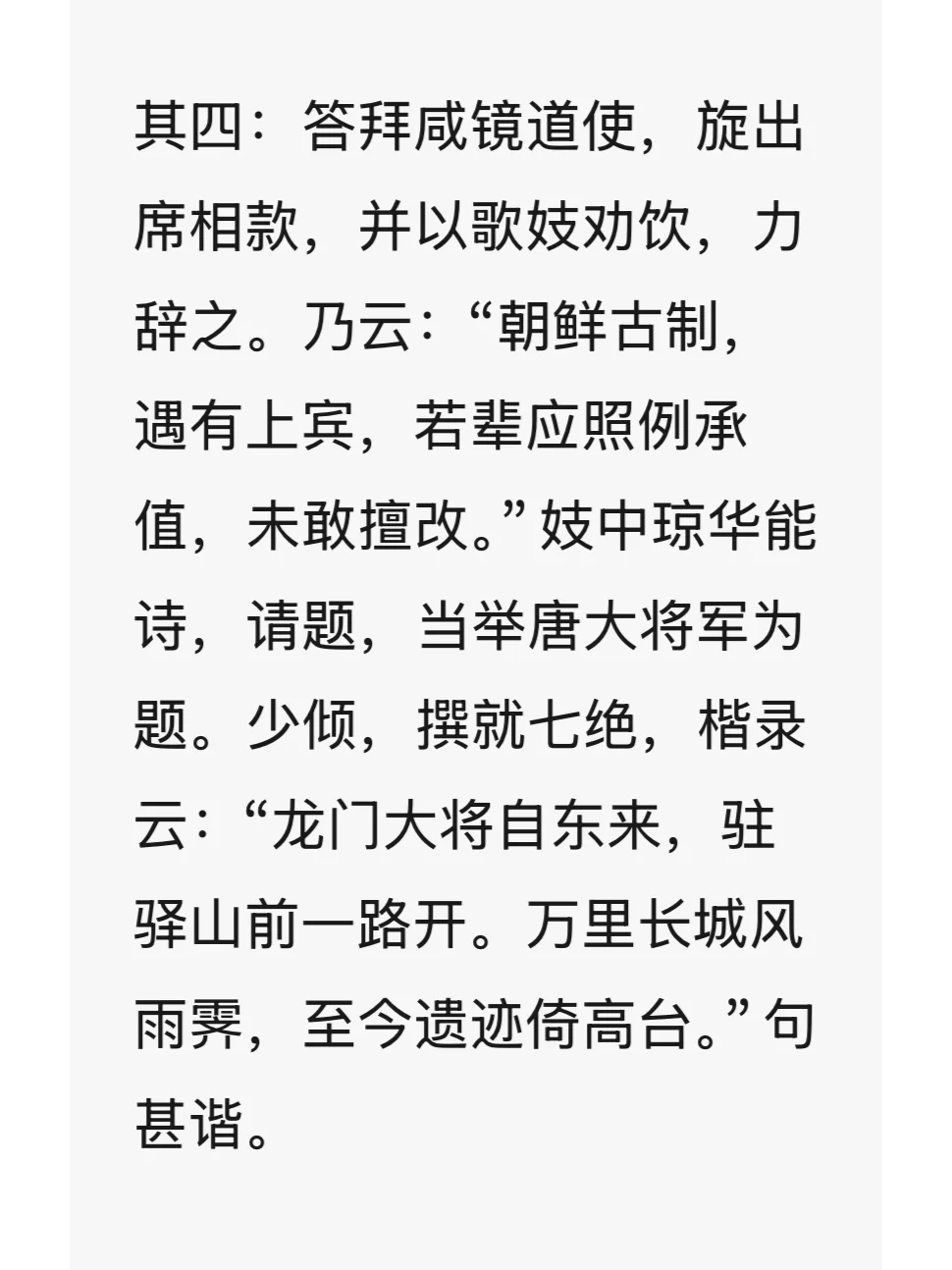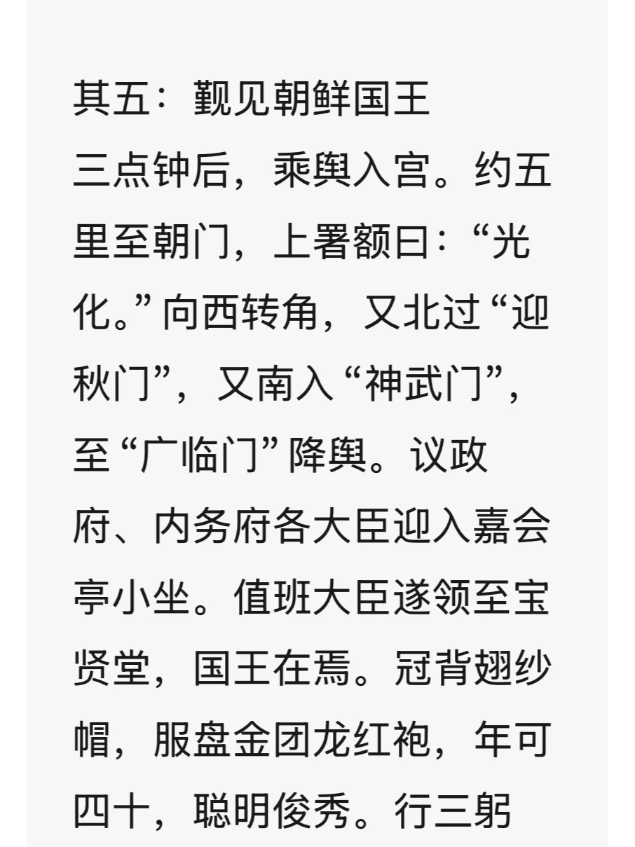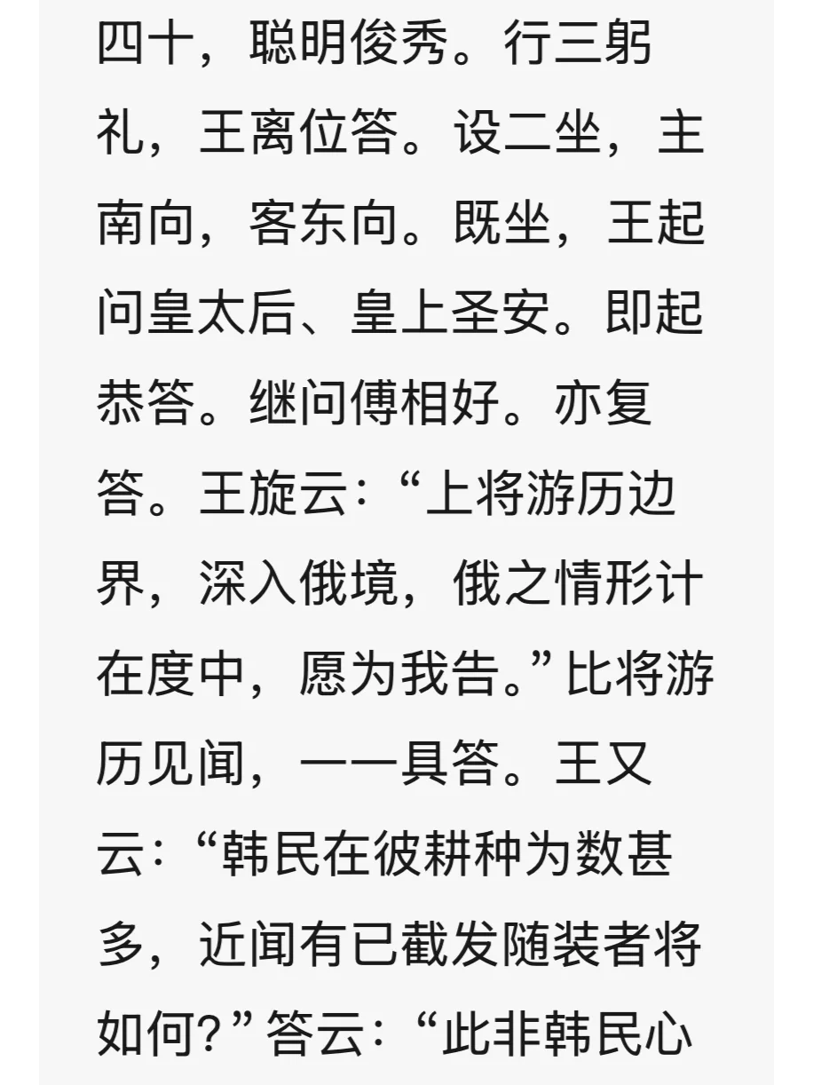 光绪十九年,太原镇总兵聂士成受李鸿章之命,以“防俄”为名,率天津武备学堂学生张祖佑、鄢玉春、冯国璋三人,勘测东北边境。作者深入帝俄、朝鲜境内,历时八个月,行程二万三千余里。一路记录沿途地理、历史、民情、风俗、土产、驻军情况,因成《东游纪程》一书。聂公虽武人出身,但文中记闻细致入微。特摘录几则甲午战争前对上下萎靡的李氏朝鲜的记述。