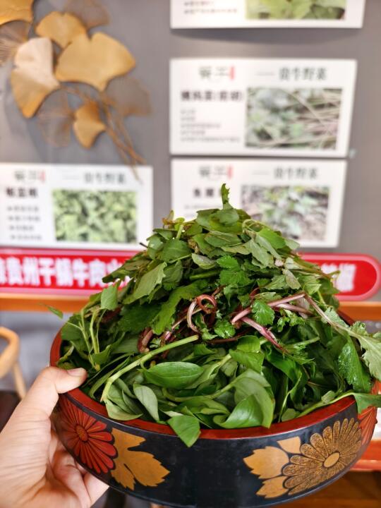 还有那个野菜拼盘,满满当当的都是新鲜野菜,搭配酸汤火锅,味道清新又解腻!🥦🥗对了,他们家上茶水也很有特色,用的是蒲公英茶🌿,清热解毒,超级贴心!🍵