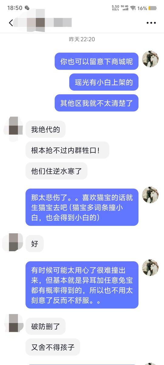 可以限制条件,比如一周只能送一只这样,也不算毁商城物价吧。。都把人逼成啥样了。。这概率是真的很不友好[抓狂R]虽然说旧版本异耳+眼睛全齐,但是我的有的号白小白一生就是四五个重复的,大号生个梦中烟薄荷耳生了很久也没出。