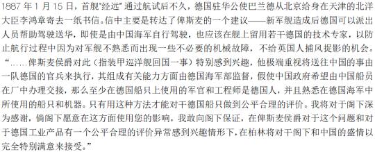 期间,德国首相俾斯麦担忧英国的贬低影响德国军舰的出口,他命令海军部监督经远级的建造,并建议由德方人员驾驶返华,避免操作故障损害德国军舰的声誉。李鸿章接受提议,接舰时安排德籍技术员随行。