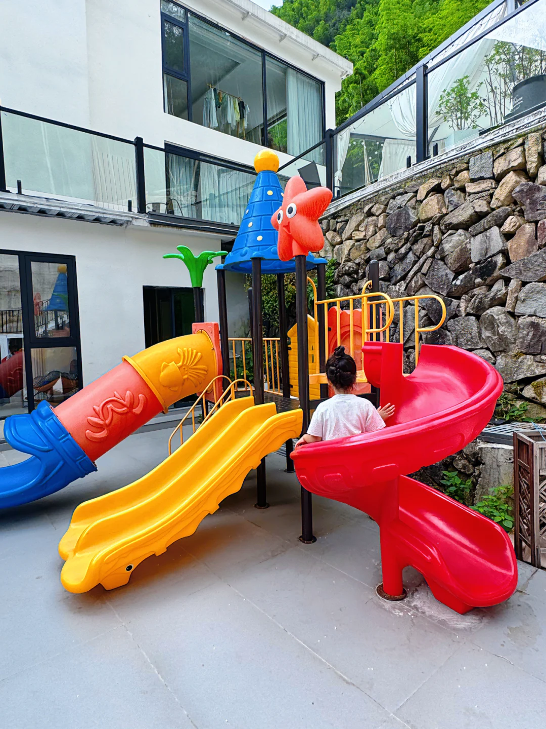 民宿门口直接连着一条超👍的溯溪!清澈的山泉水、冰冰凉凉的溪流,光脚踩进去瞬间降温~可以打水仗,捞小鱼,还有秋千、皮划艇、透明船……孩子🧒玩上一天都不腻!🌊
