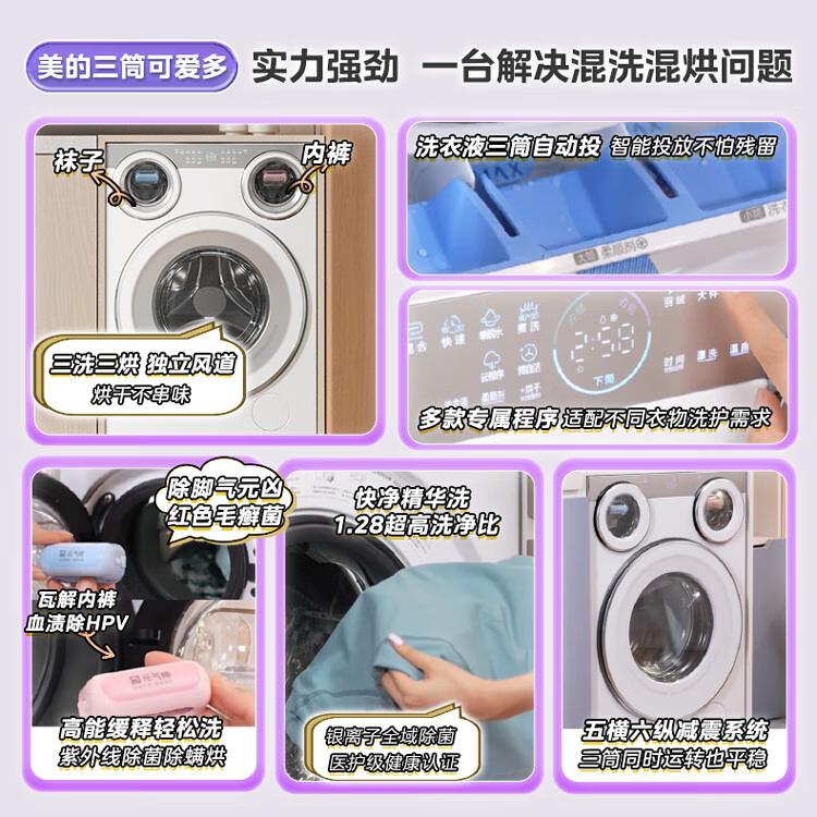 美的可爱多直接做到三筒同步洗、同步脱水、同步烘干。自研的智能热管理+独立内循环烘干,干衣速度快,还能彻底杜绝风道串味、细菌互串。