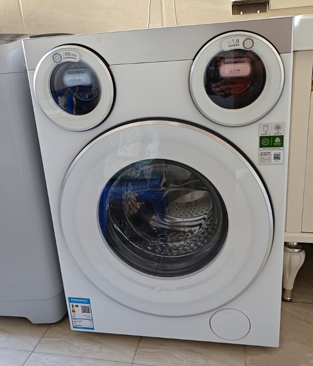 很多人不敢选三筒机,核心就两个字:占地。美的可爱多最亮眼的一点,就是做到了全球首款台下式三筒布局。常规家用850mm橱柜高度里,硬生生塞下一个10公斤主筒,再加两个专属小筒,不用加高柜子,不用改动家装。
