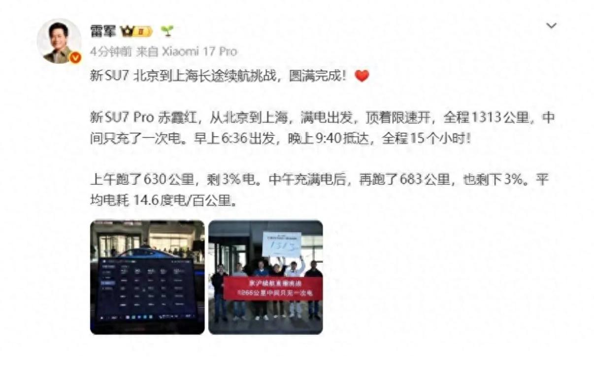 雷军这次真开了一趟京沪高速,不是试驾,不是彩排,就是早上六点半从北京小米科技园出发,三个人,一台SU7 Pro,一路开到上海金桥的小米5G未来中心。时间掐得挺准,晚上九点四十到的,中间只停了一次,充了十几分钟电。路上车速基本在110到120之间,空调一直开着,后备箱塞满了直播设备,后排还坐了俩人。不是省电模式那种开法,就是普通车主上高速会怎么开,它就怎么开。