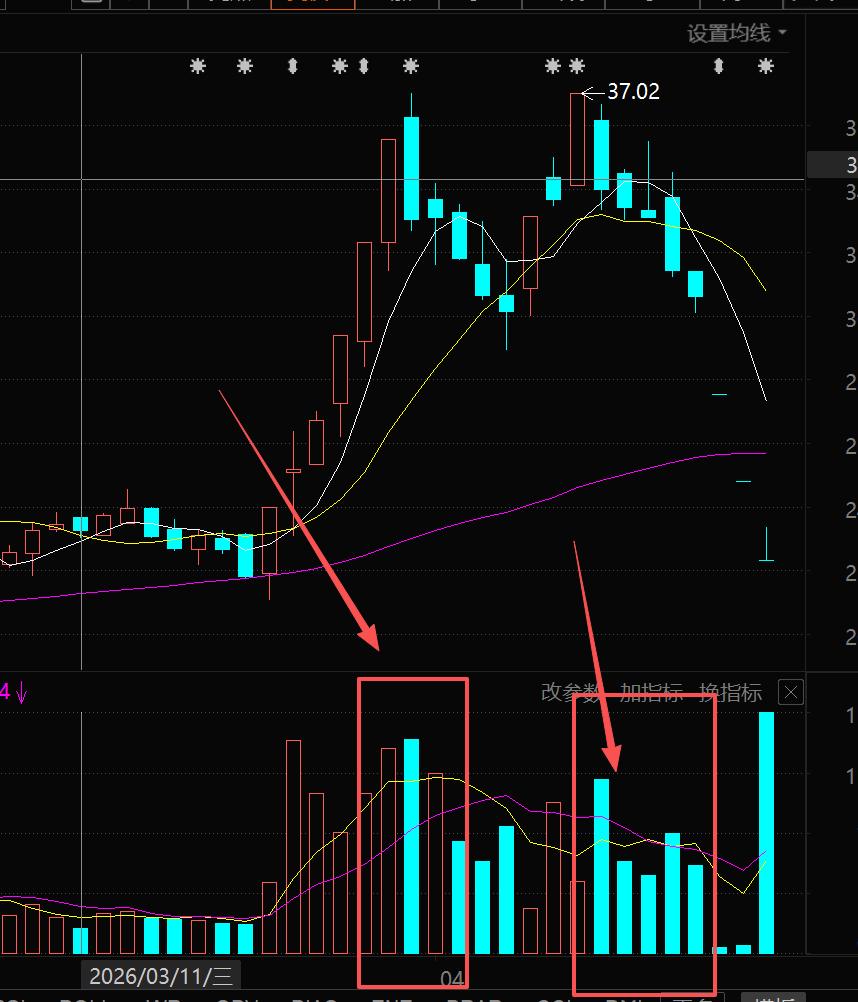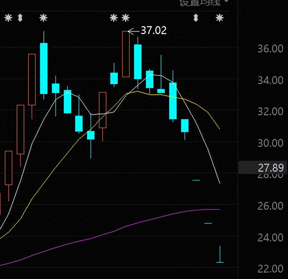 股价触及 37.02 元高点后,见顶回落信号彻底确认,随后连续暴力大阴线砸穿所有短期、中期均线,均线系统直接转头向下,标准空头趋势完全成型,下跌闸门彻底打开。