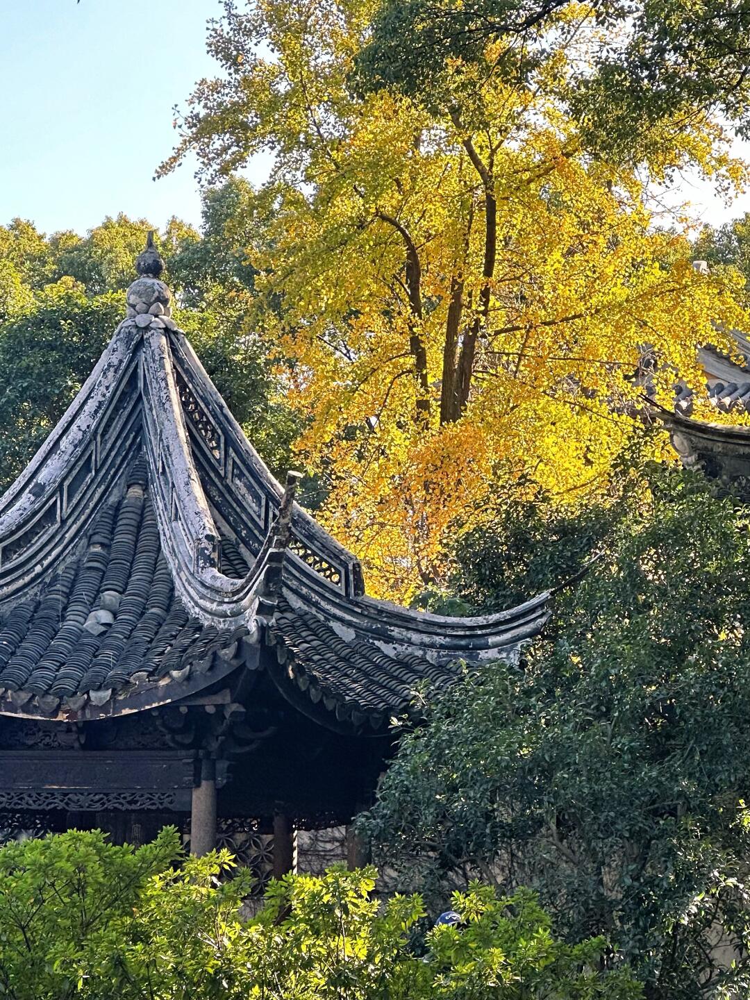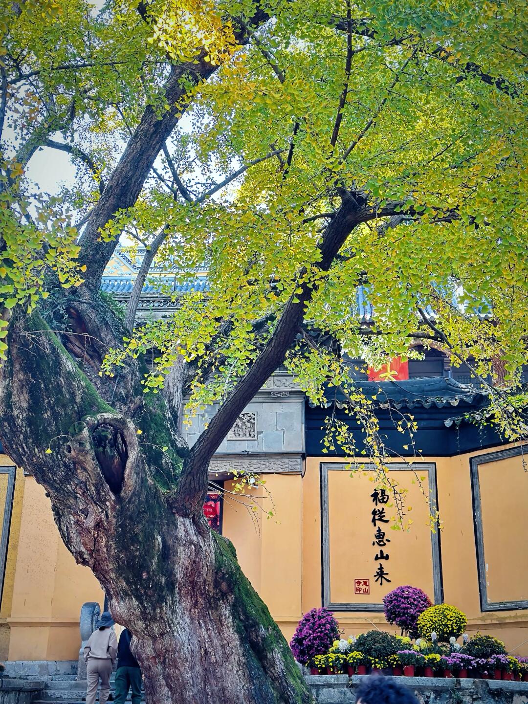 惠山寺门前这棵六百多年的古银杏已经有点变黄了,但还有点绿,年纪大比较内敛沉稳。