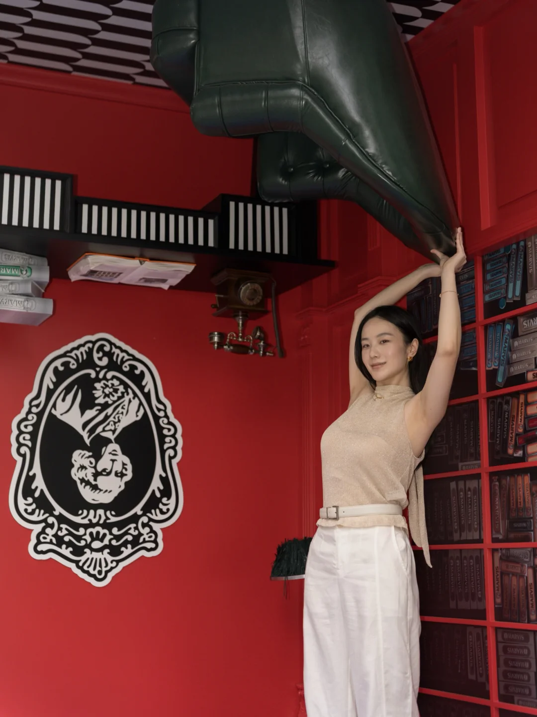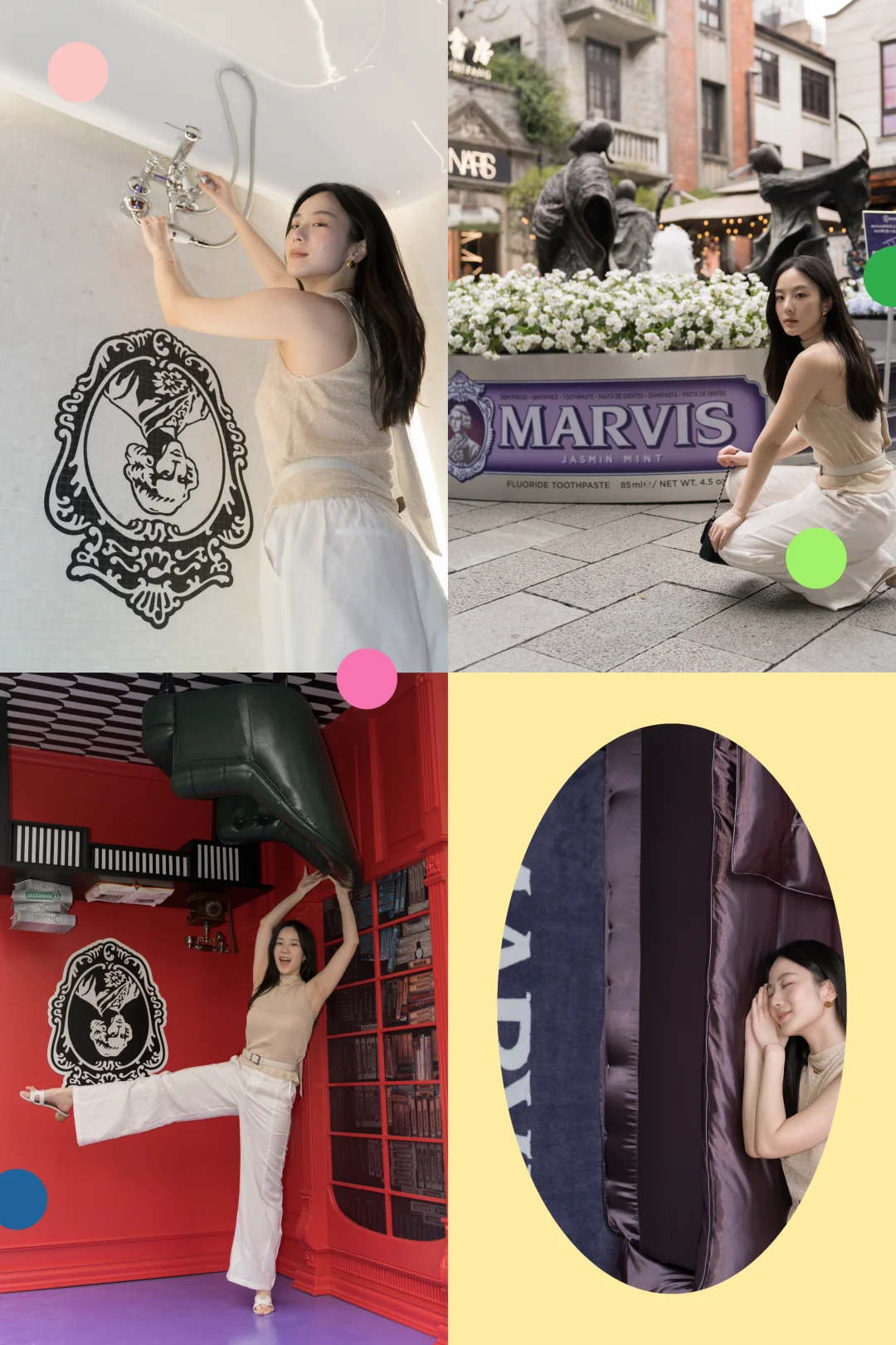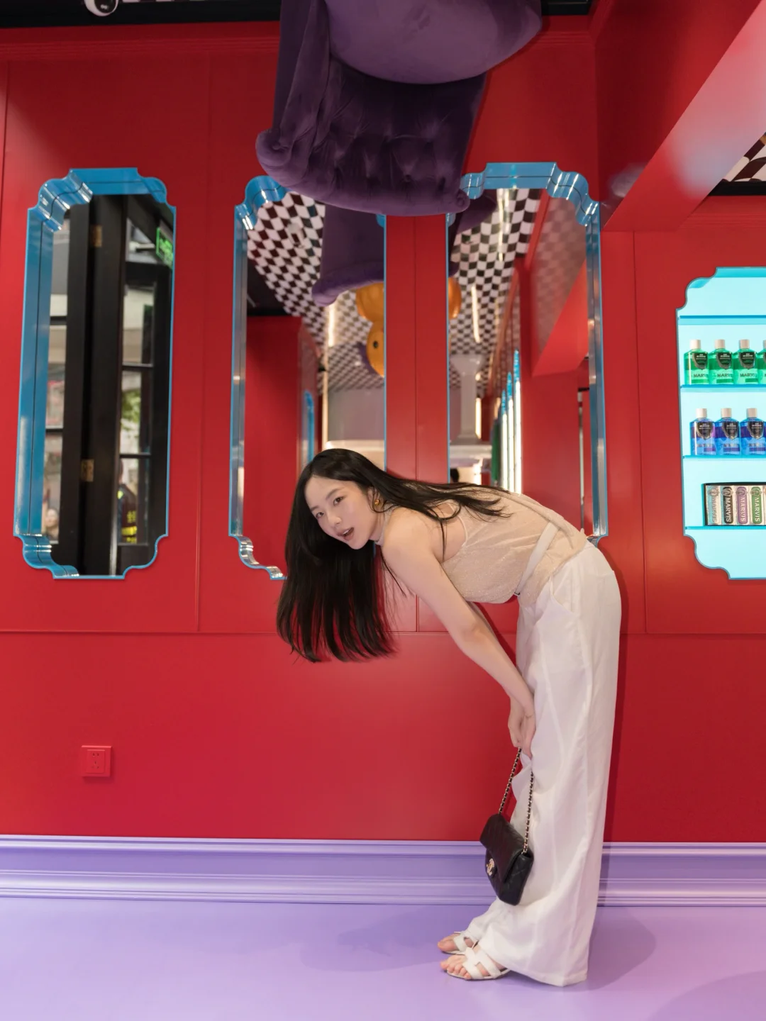刚溜进新天地的MARVIS概念店就发现整个世界被悄悄倒了过来——浴缸和洗手台在天花板上闲逛,小黄鸭优哉游哉漂向云端,连书架上的书本都倒立,墙面上还嵌着一张四柱床!