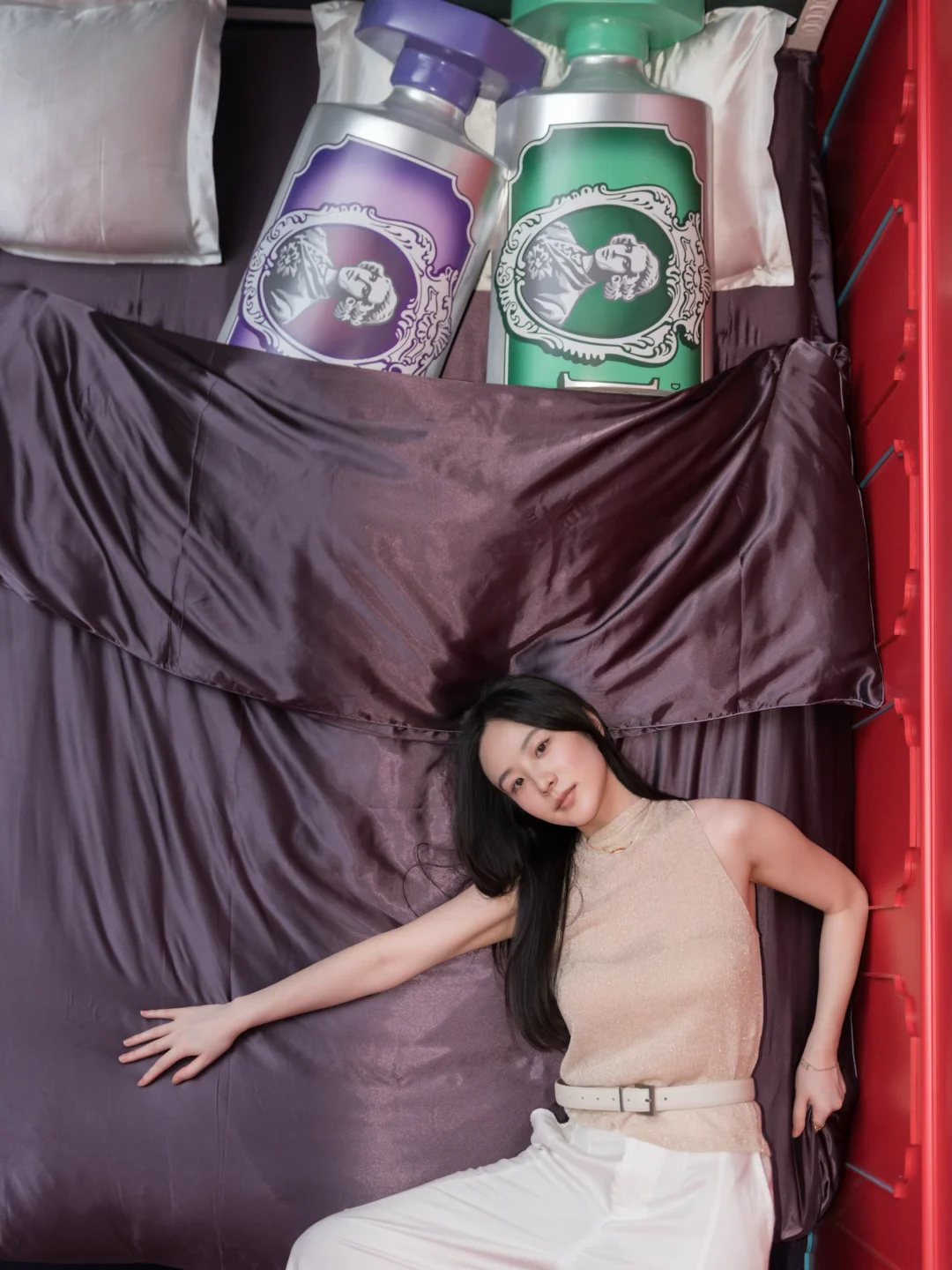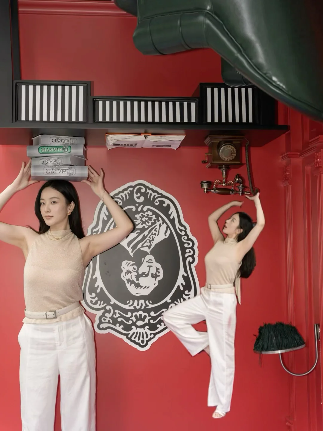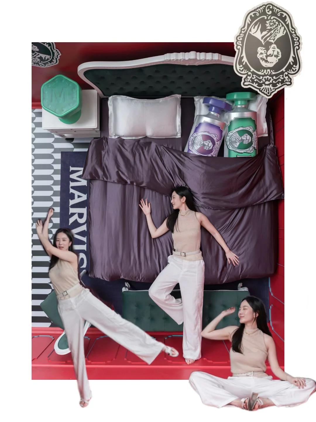 刚溜进新天地的MARVIS概念店就发现整个世界被悄悄倒了过来——浴缸和洗手台在天花板上闲逛,小黄鸭优哉游哉漂向云端,连书架上的书本都倒立,墙面上还嵌着一张四柱床!