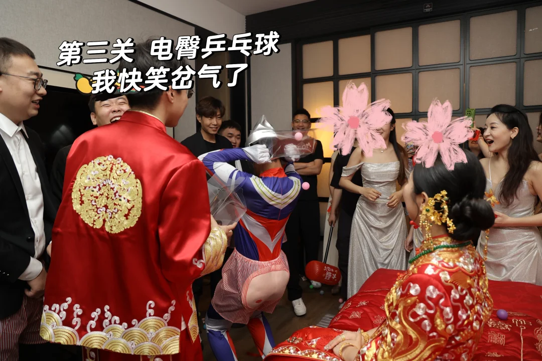 新郎和伴郎团派出6人,穿上电臀裤,用1分钟内扭动pp,摇出腰间盒子的所有乒乓球,剩几个球就给几个🧧
