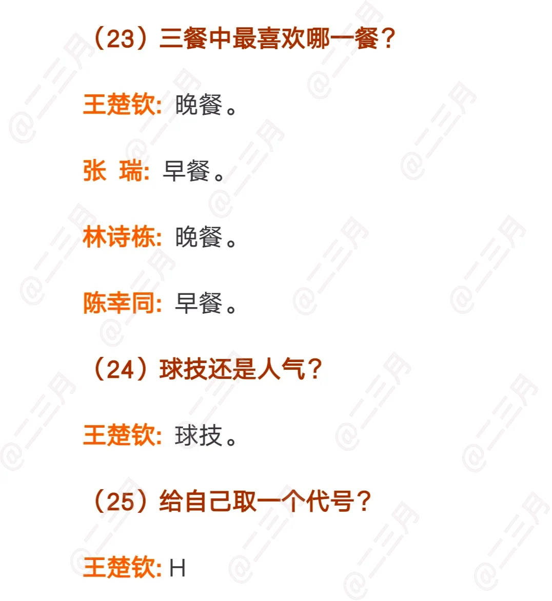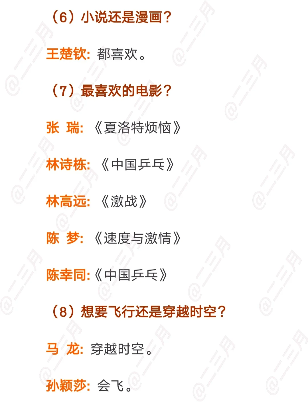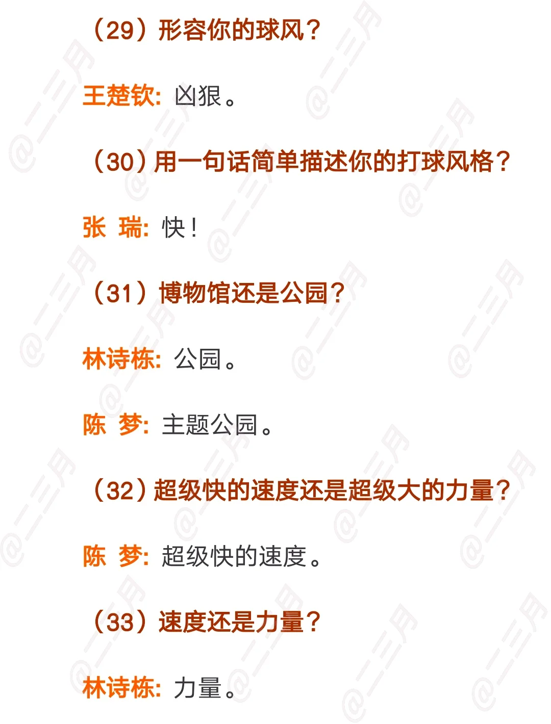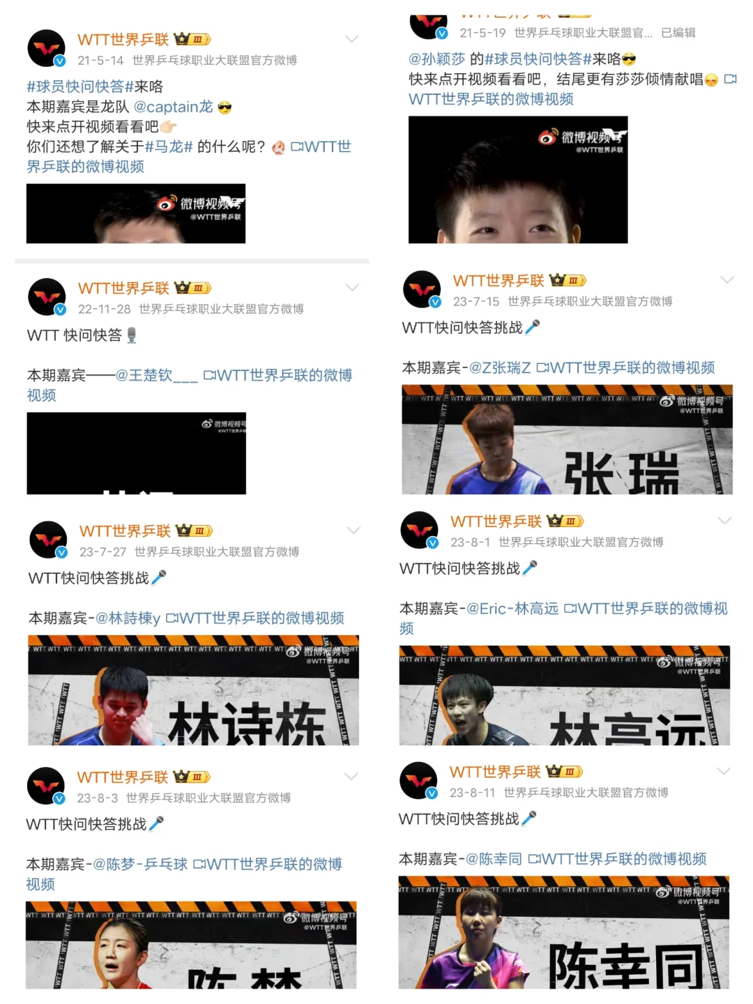 WTT国乒球员快问快答合集,一共八个视频,WTT发的是单人的快问快答,我整理的文字版是把相似的问题放到一起的。大家感兴趣可以去看看。