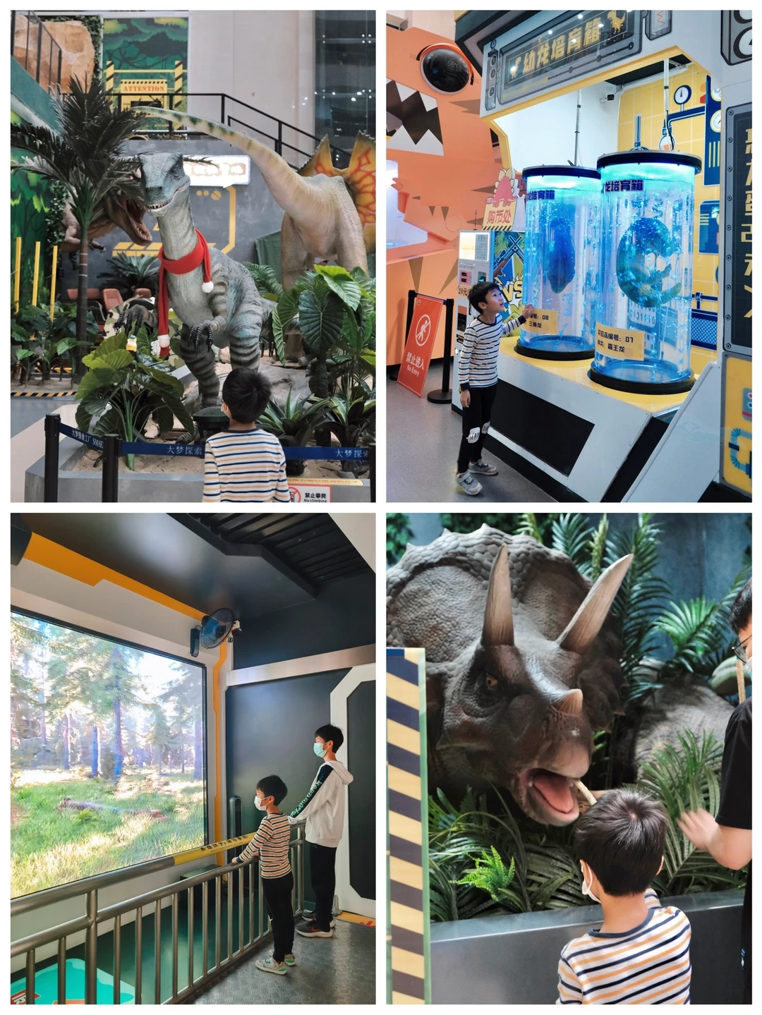 1️⃣层恐龙馆不止有模型,甚至还能互动,二宝去体验了一把喂恐龙;沉浸式vr 游戏里的互动生动有趣也不可怕,小朋友都可以自己玩;老大比较喜欢玩刺激的,7米垂直滑梯、高空探索正好戳中了他的兴趣点;拆解的奥迪R8让小朋友对机械有了初步的认知,还可以互动👍