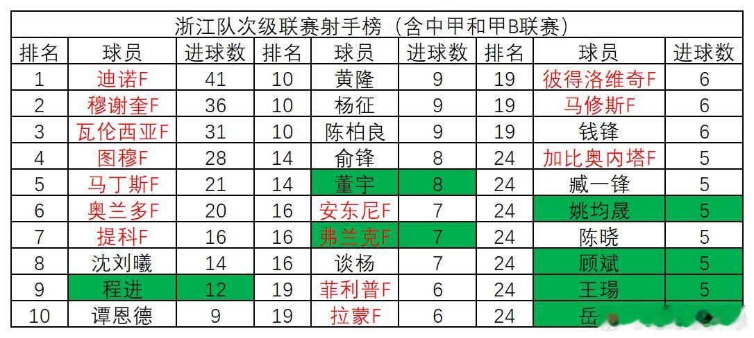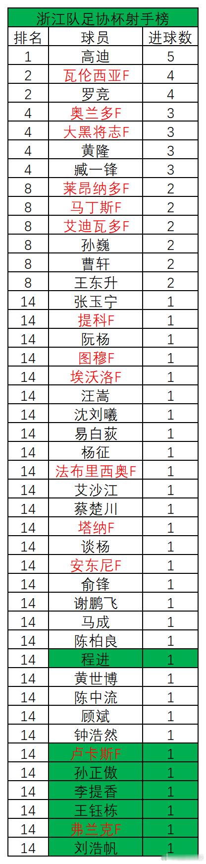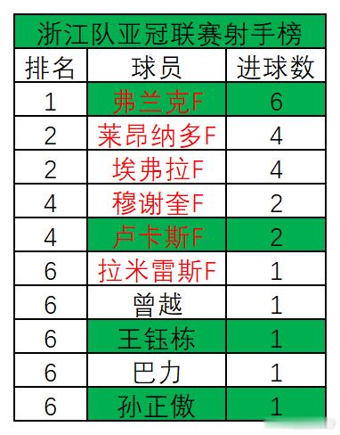 浙江队队史各项赛事射手榜(包括中超、次级联赛、足协杯和亚冠联赛)统计如下,请各位