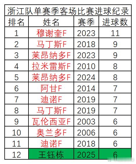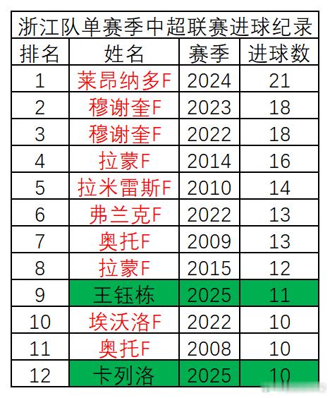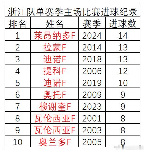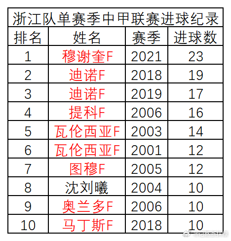 浙江队队史单赛季进球纪录,及中超、中甲两项主要赛事,主场、客场单赛季进球纪录首发如下。请各位查阅,如有错漏请予以指正。