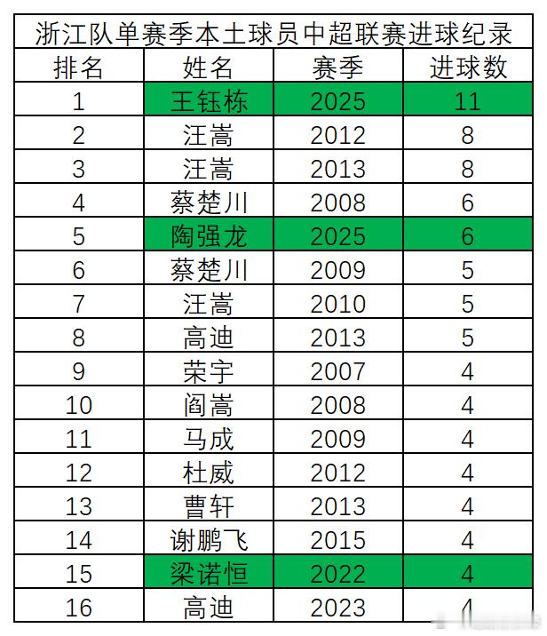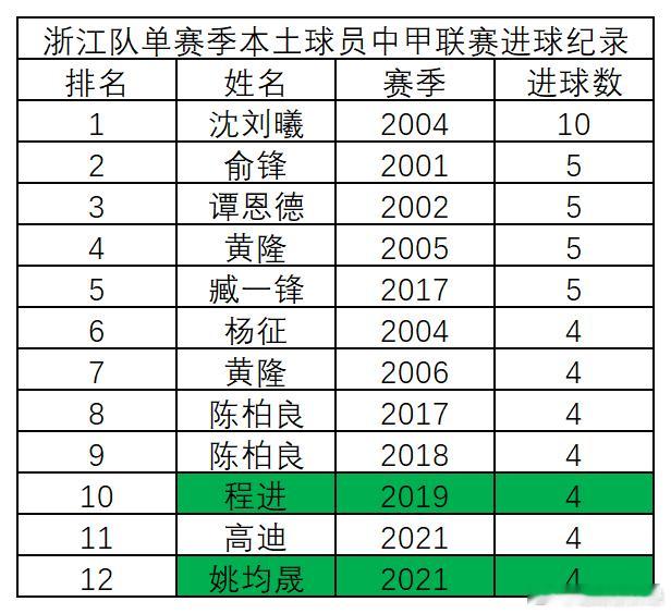 浙江队队史单赛季本土球员进球纪录,及中超、次级联赛两项主要赛事进球纪录首发如下,