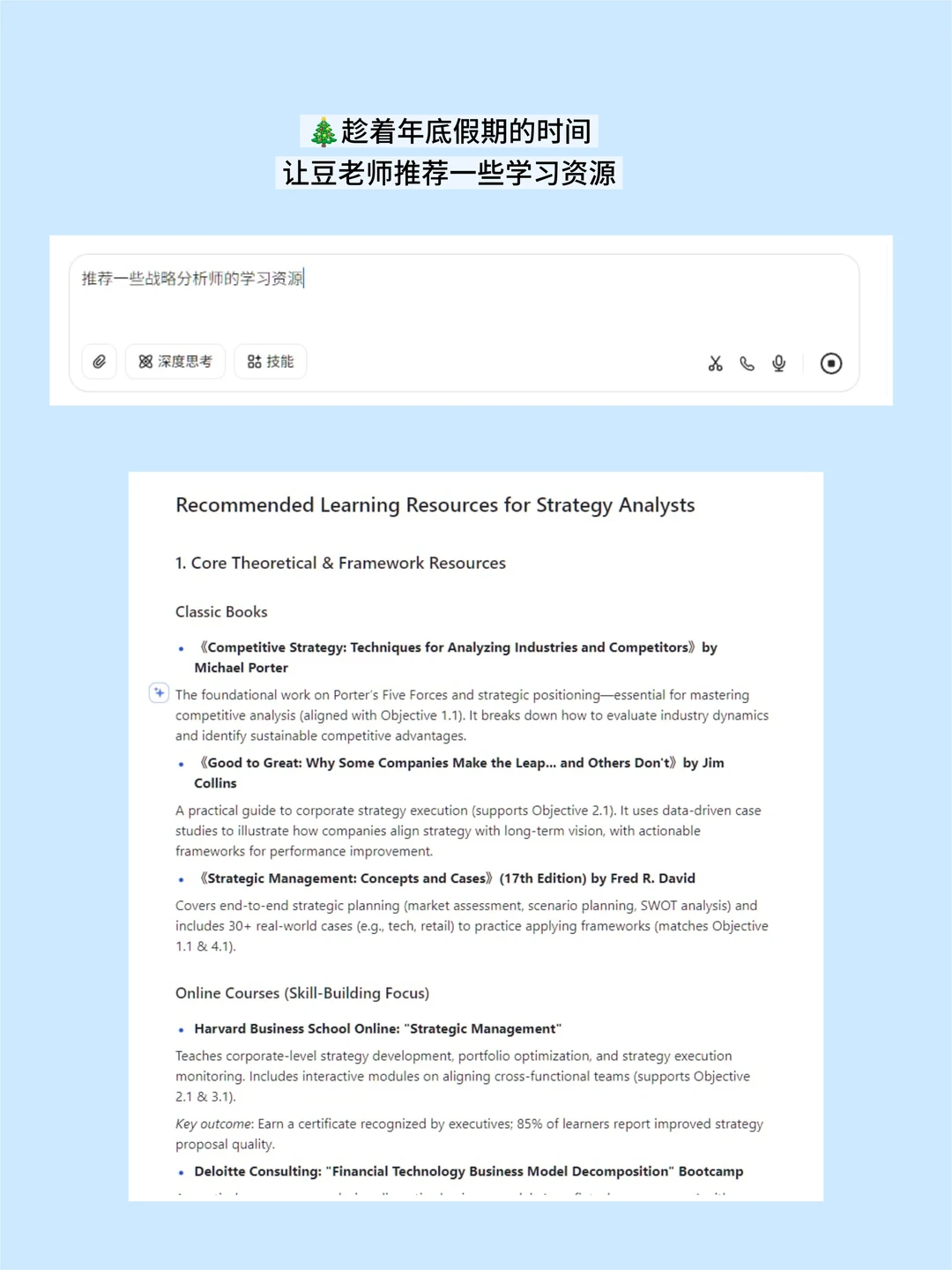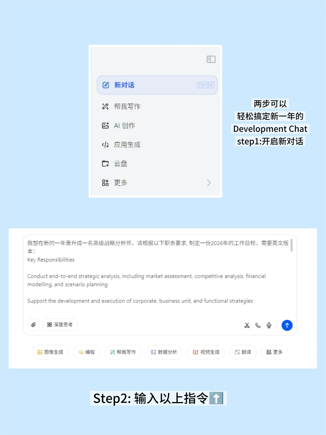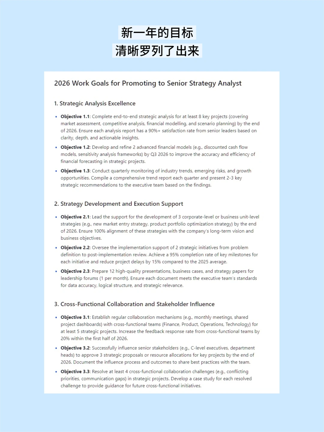 度假回来,可以趁新年的时间和老板聊聊升职加薪的目标,借助豆bao的帮助,可以让准备更加充分。只需要在对话框输入指令:''我想在新的一年晋升成一名高级战略分析师,请根据以下职责要求, 制定一份2026年的工作目标,需要英文版本。''显得有备而来,老板也会更加重视你的职业发展。