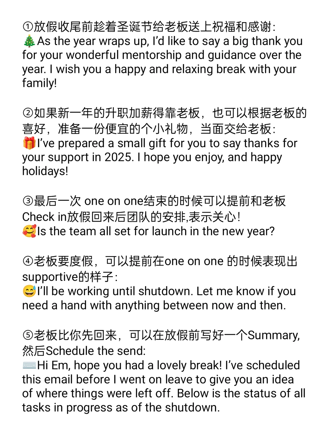 ③最后一次 one on one结束的时候可以提前和老板Check in放假回来后团队的安排,表示关心!