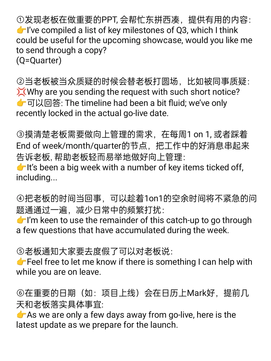 ③摸清楚老板需要做向上管理的需求,在每周1 on 1, 或者踩着End of week/month/quarter的节点,把工作中的好消息串起来告诉老板, 帮助老板轻而易举地做好向上管理: