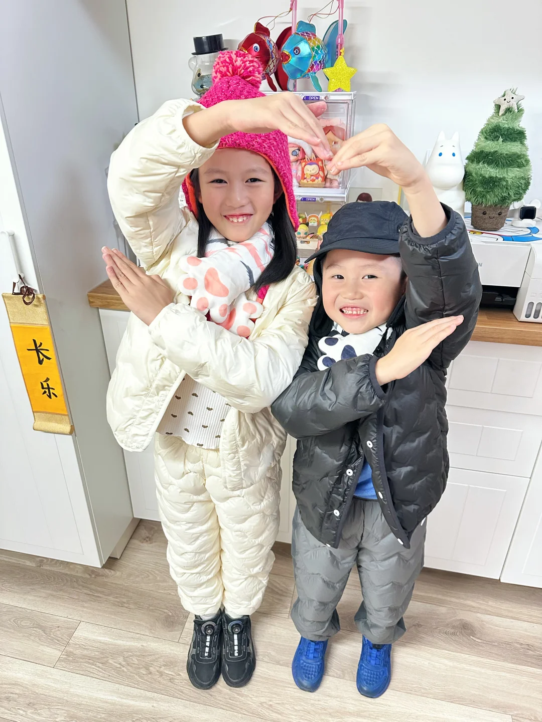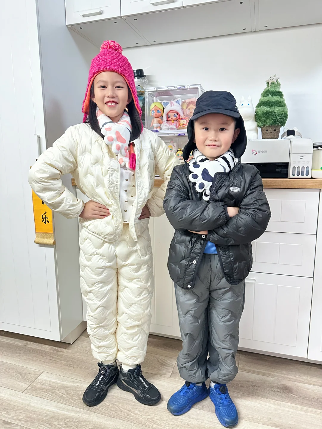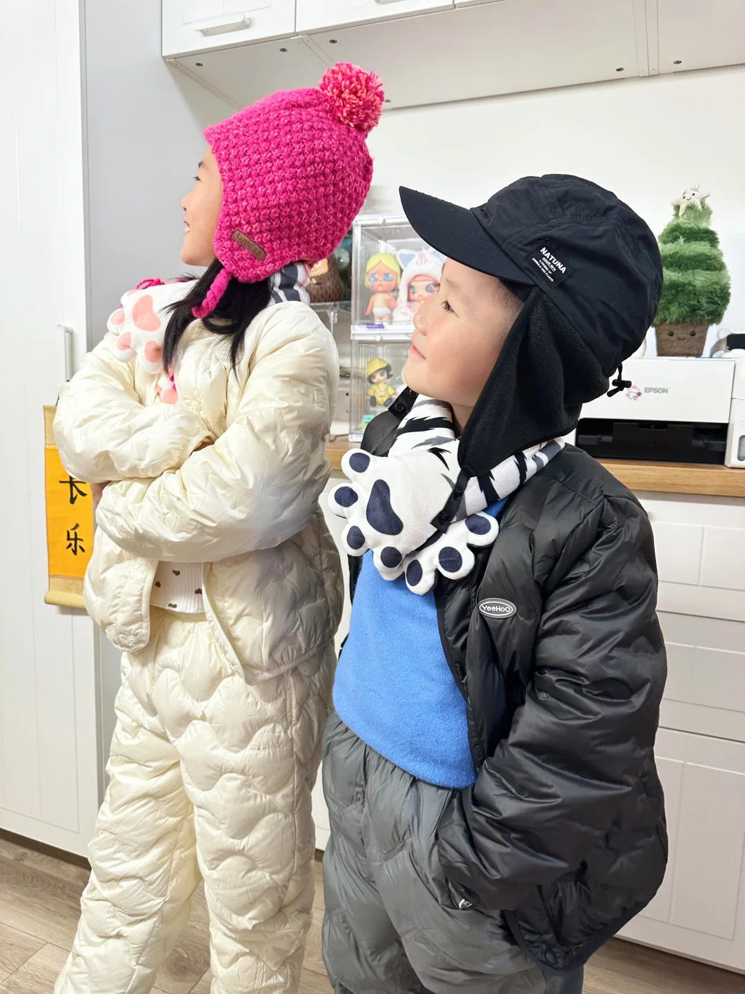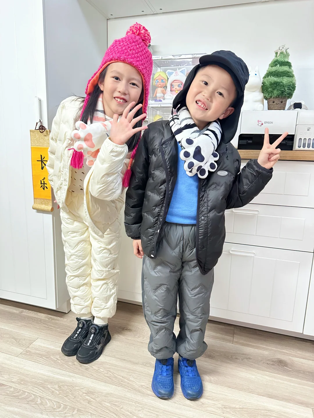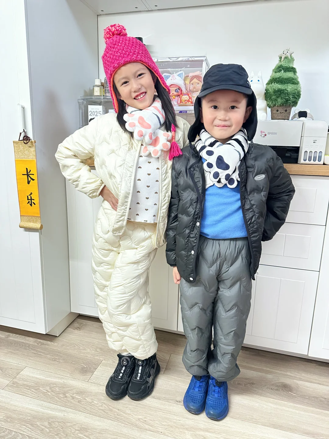 再围上发热围巾,戴上帽子,两个小家伙暖暖的去上学啦~