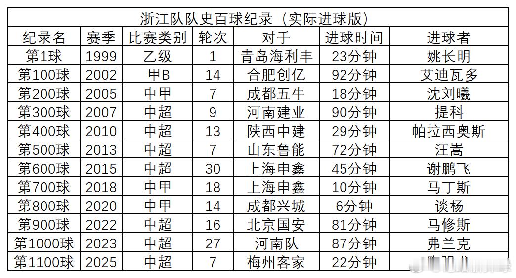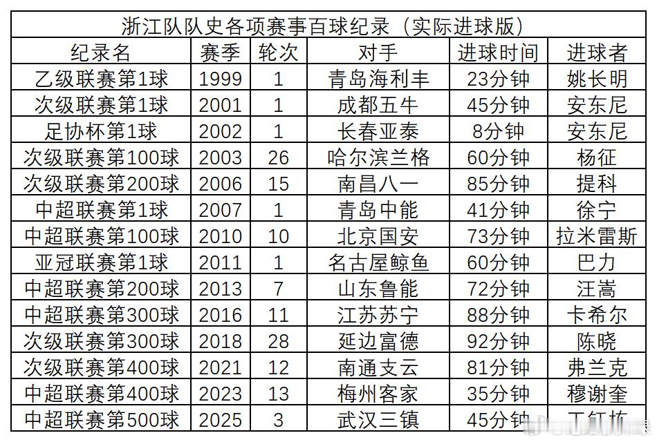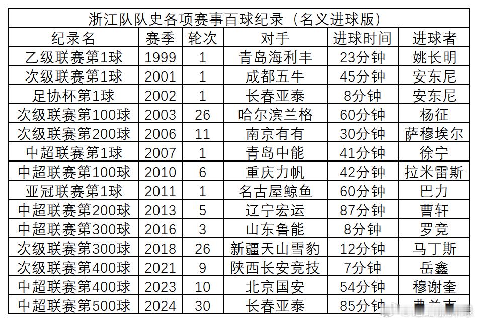 浙江队队史百球纪录与各项赛事百球纪录(包括名义进球和实际进球版)发布如下,请各位