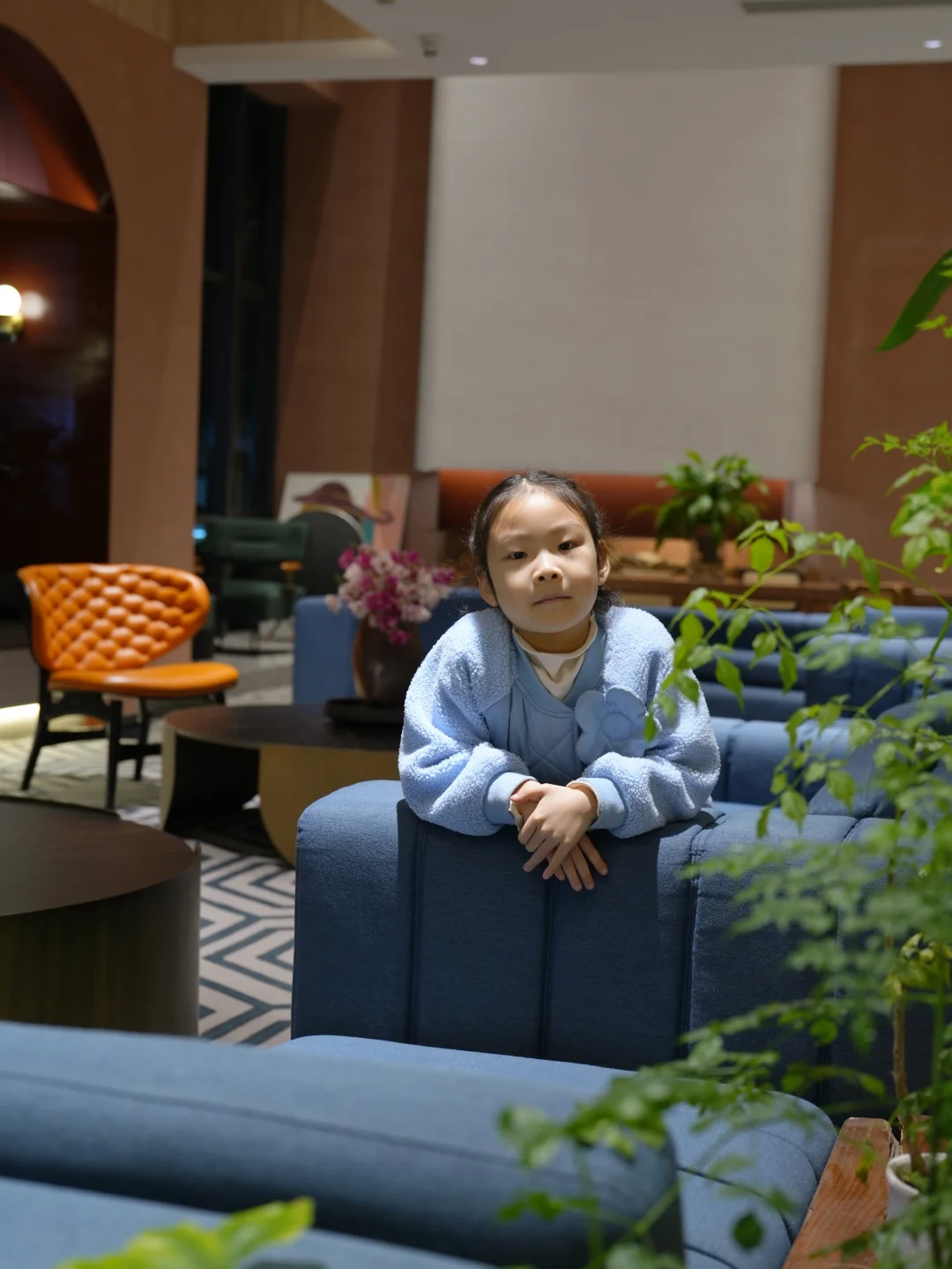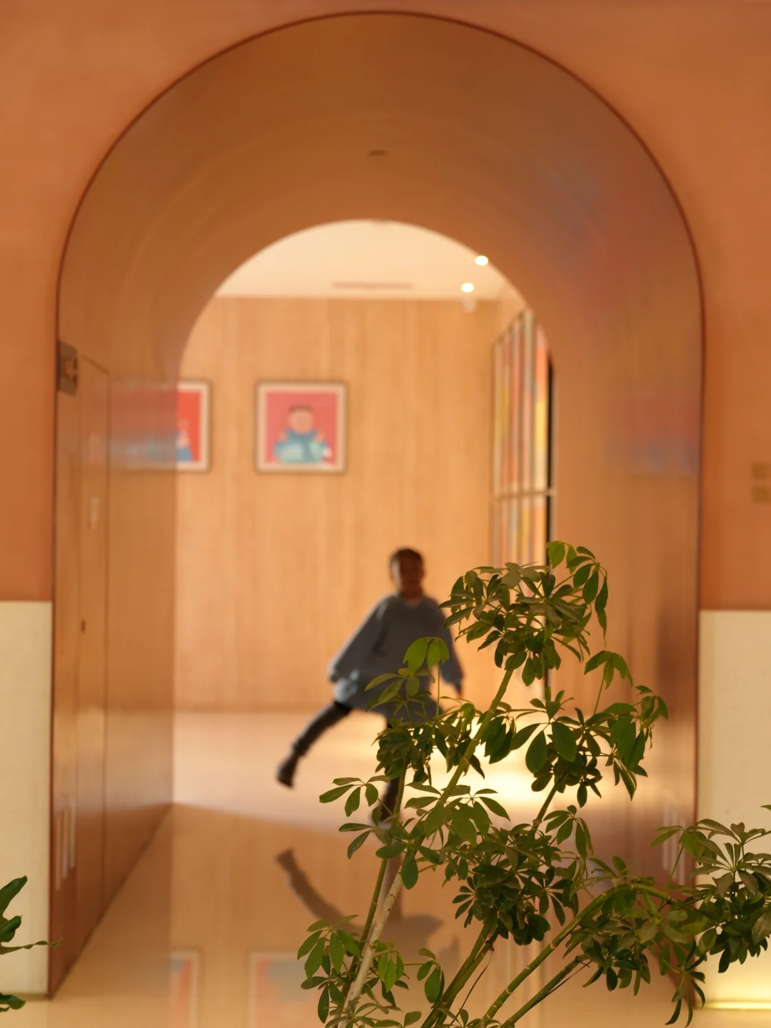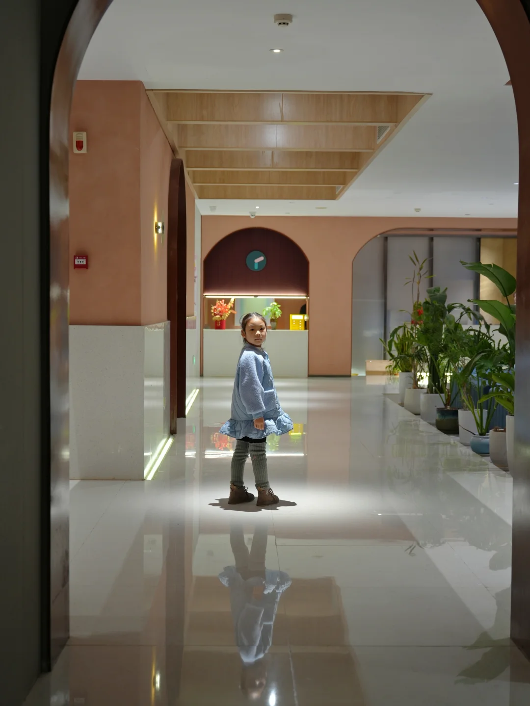 一进门就被绿植和鲜花治愈了,大堂像个小艺术馆,摆满了当代艺术品。艺术氛围感拉满。拱形走廊的光影绝了,忍不住给娃拍了几张,瞬间有了“美术馆大片”的感觉