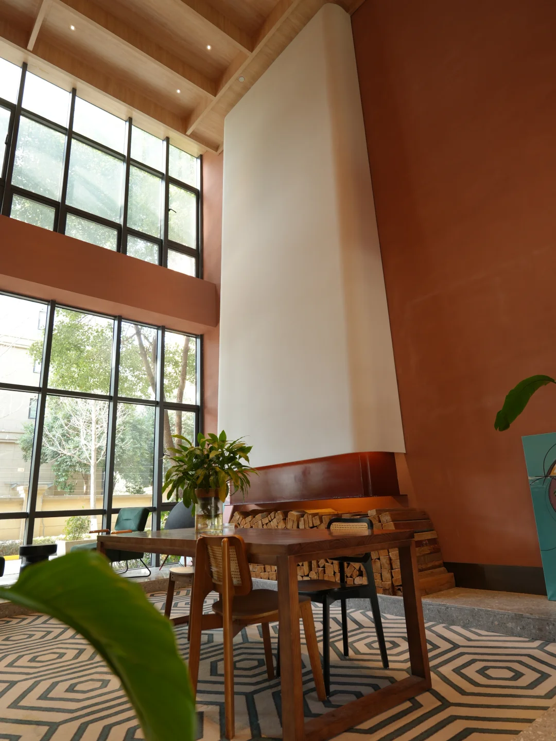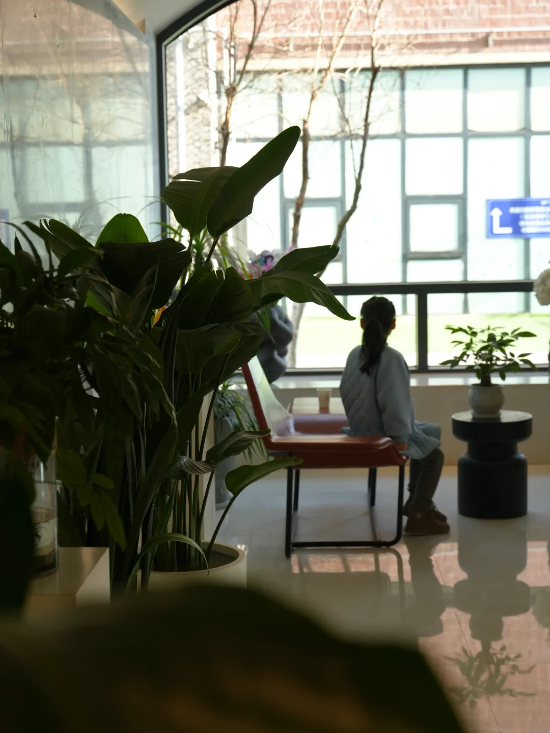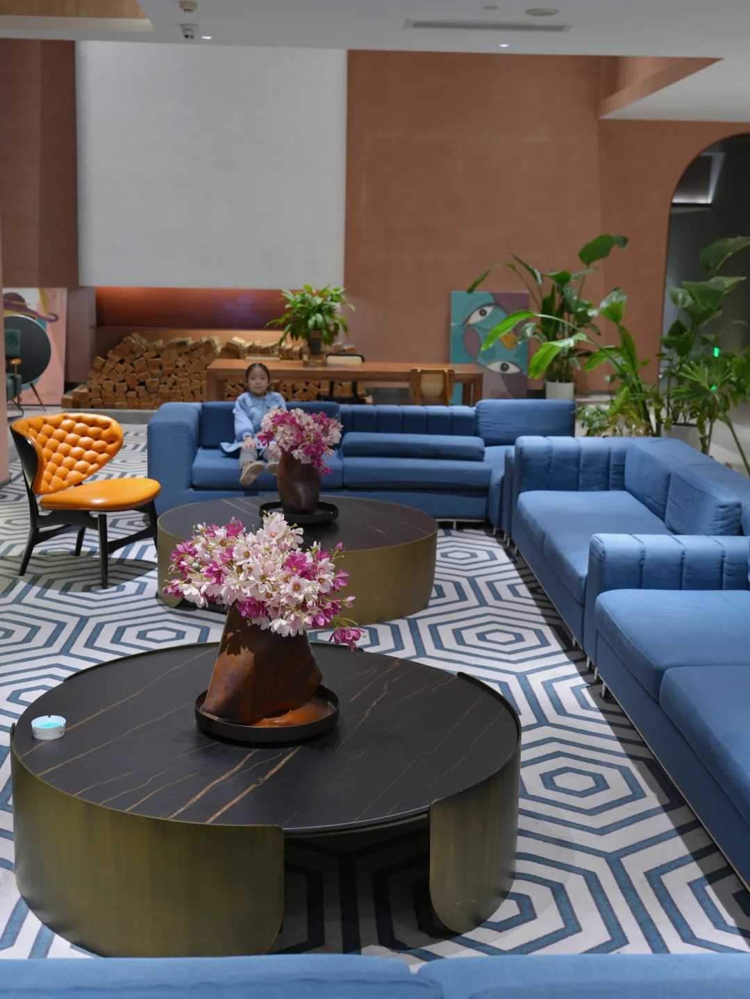 一进门就被绿植和鲜花治愈了,大堂像个小艺术馆,摆满了当代艺术品。艺术氛围感拉满。拱形走廊的光影绝了,忍不住给娃拍了几张,瞬间有了“美术馆大片”的感觉