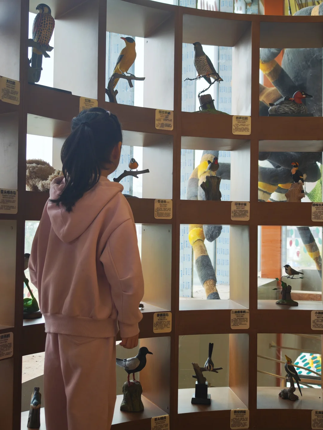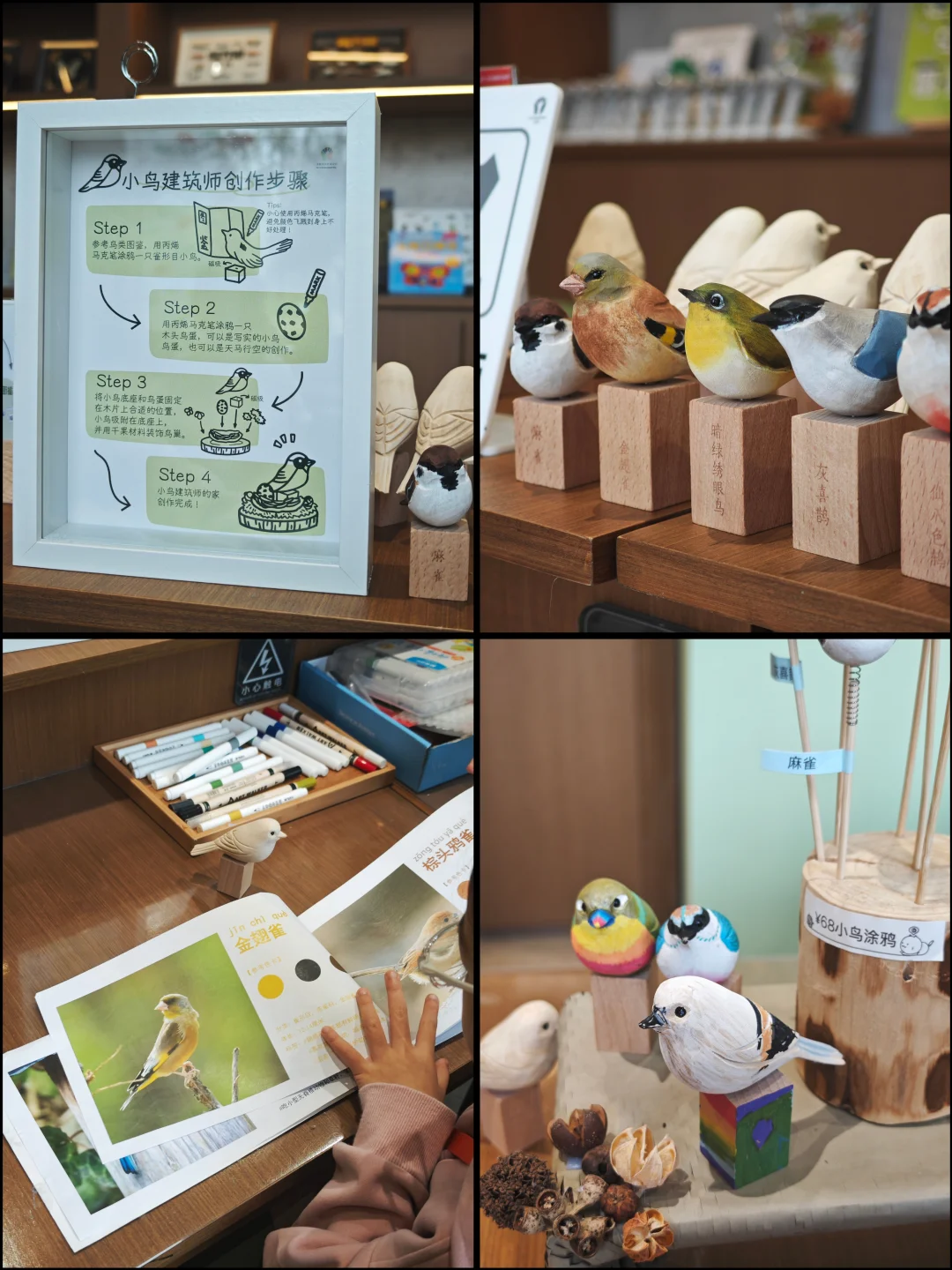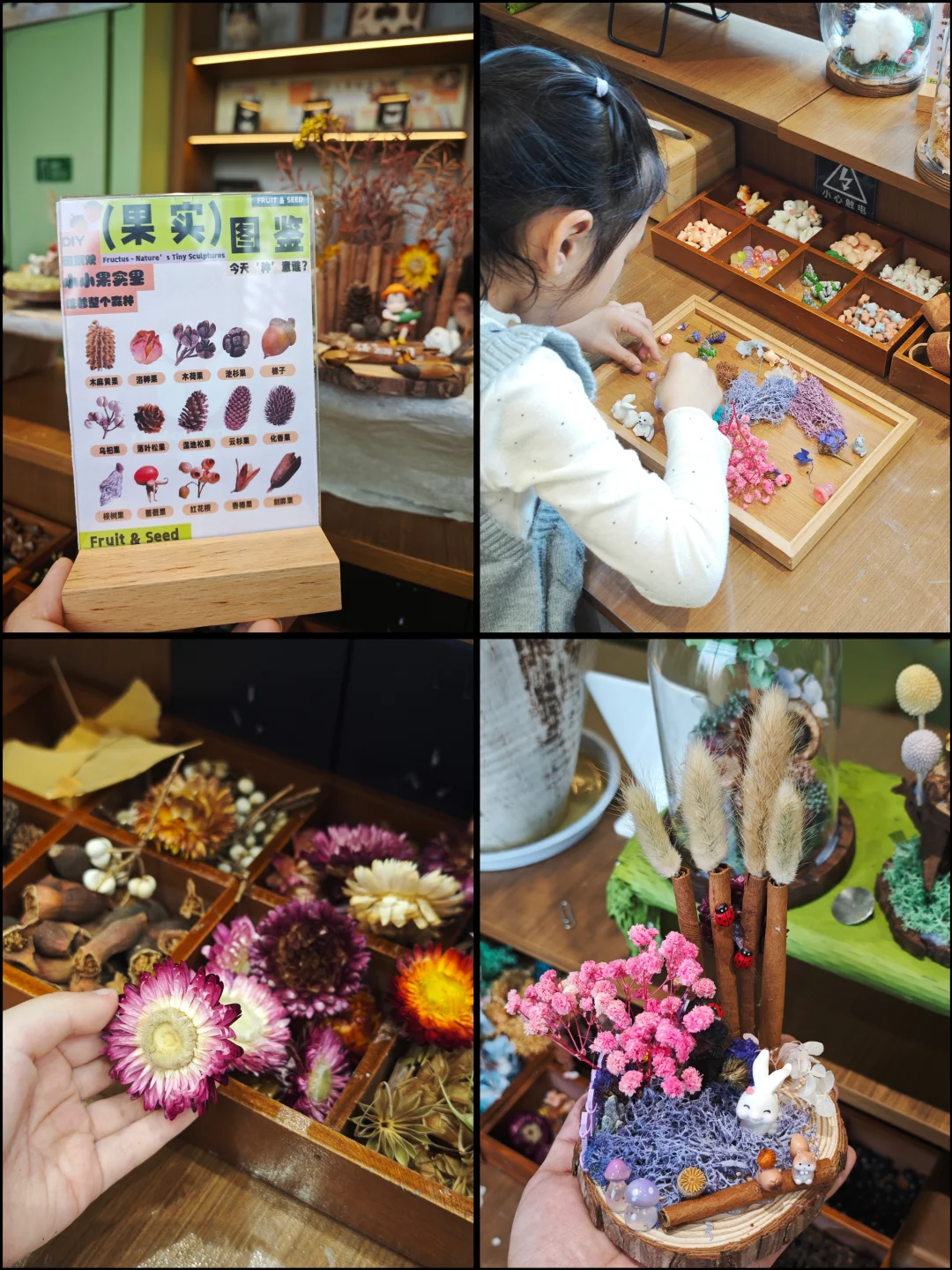 一进门孩子就被各种自然材料做的手工吸引住了。这里不是普通的DIY,所有材料都是来自大自然的松果、树叶、树根和干花。我们选了做木片微景观,老师会先耐心讲解步骤,然后全程让孩子自己动手,看着小家伙专注的样子,真的太治愈了!做完后孩子特别有成就感,还学到了很多植物知识,后来不过瘾,又画了一只小鸟,全手工雕刻的木质小鸟,小朋友真的好喜欢