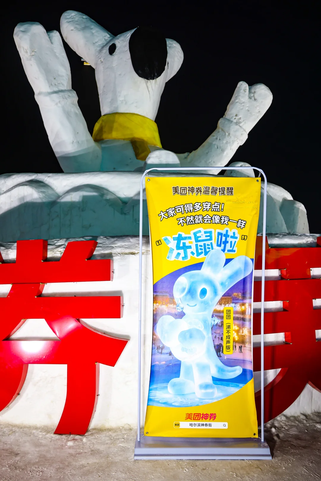 和朋友在冰雪大世界闲逛看到美团神券的袋鼠鼻子上挂着好几颗冰柱