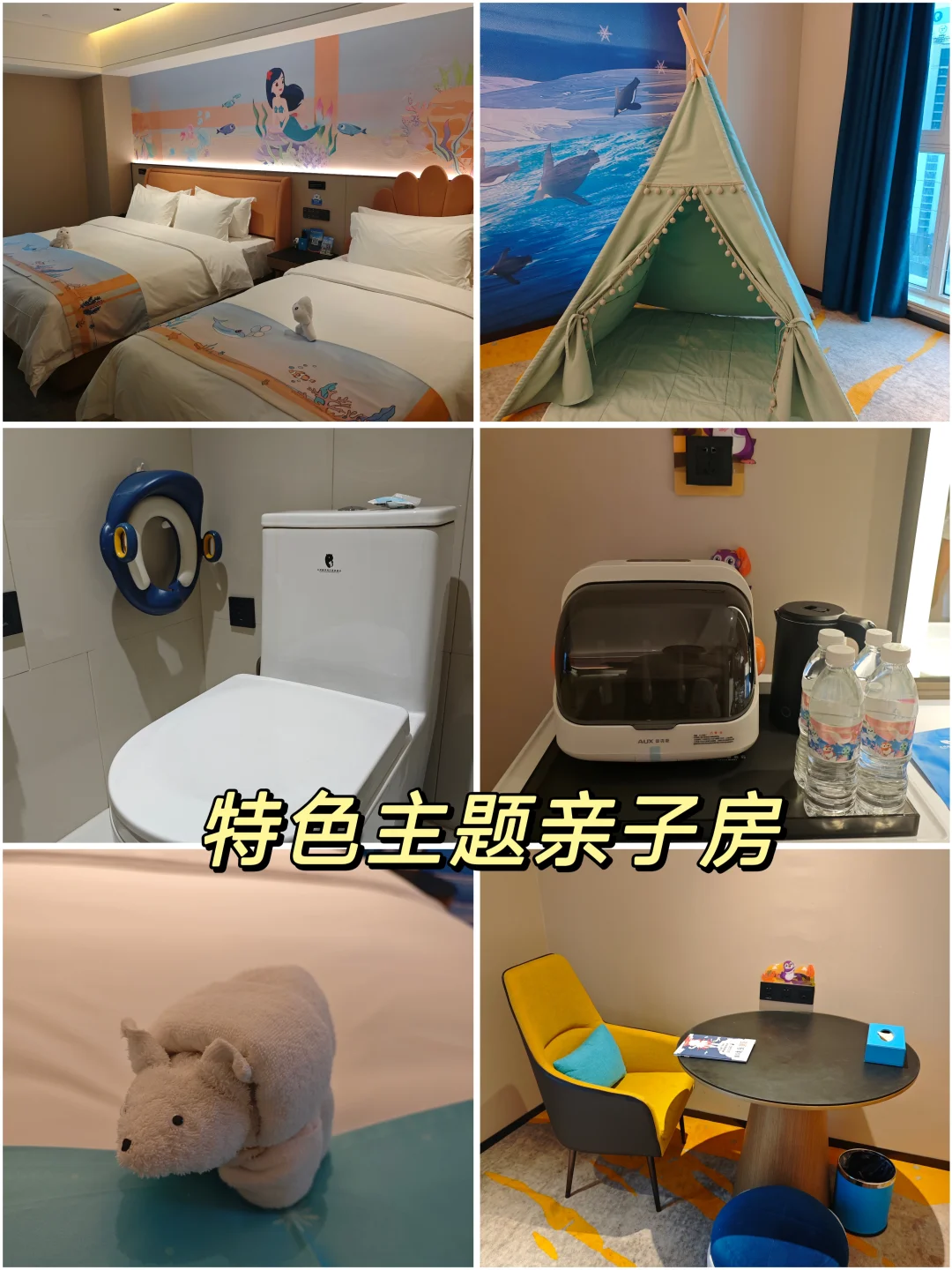 ✅ 主题房萌翻天:企鹅/北极熊/美人鱼亲子房,儿童帐篷、儿童专用马桶圈、消毒柜全配齐,娃一进门就钻进帐篷当“海洋探险家”