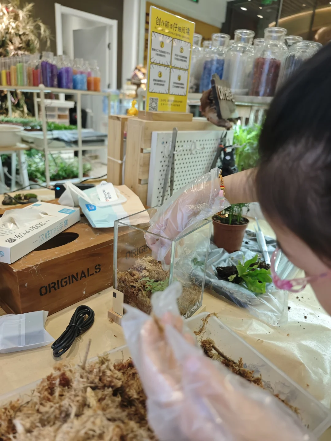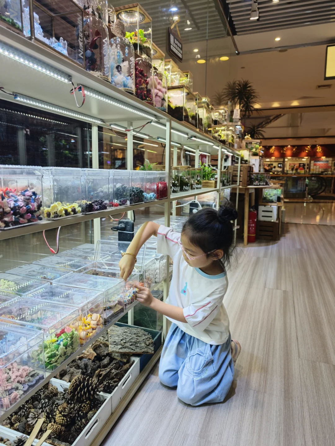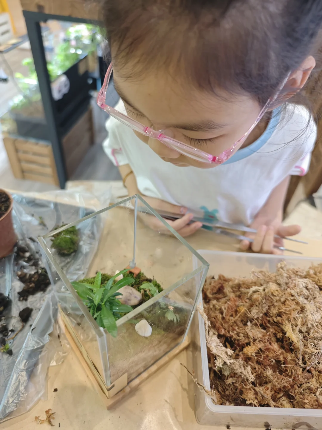 小朋友自己选了微景观生态瓶DIY,全程自己动手!铺石子、摆苔藓、种小植物,再放上小房子和迷你动物摆件,娃像个小园艺师一样认真设计,最后捧着自己的“迷你森林”超有成就感✨!店里不仅能做微景观DIY,还能摸蜥蜴🐸孩子简直开心到不想走!