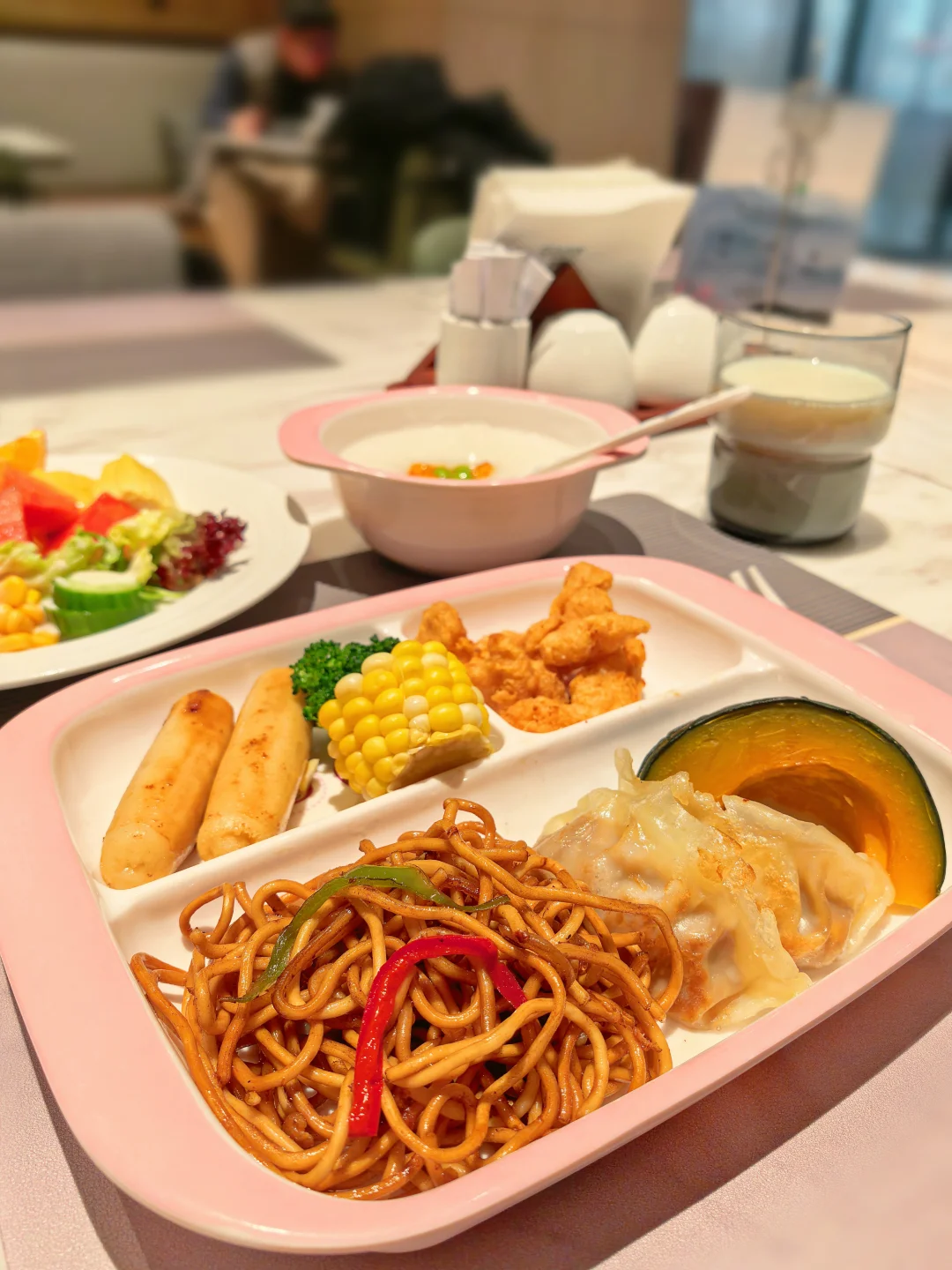 早餐品类很丰富,不仅有适合孩子的点心牛奶,还有热干面、烧卖这些武汉特色,老人家也吃得超满意,一家人的胃都被照顾的很好