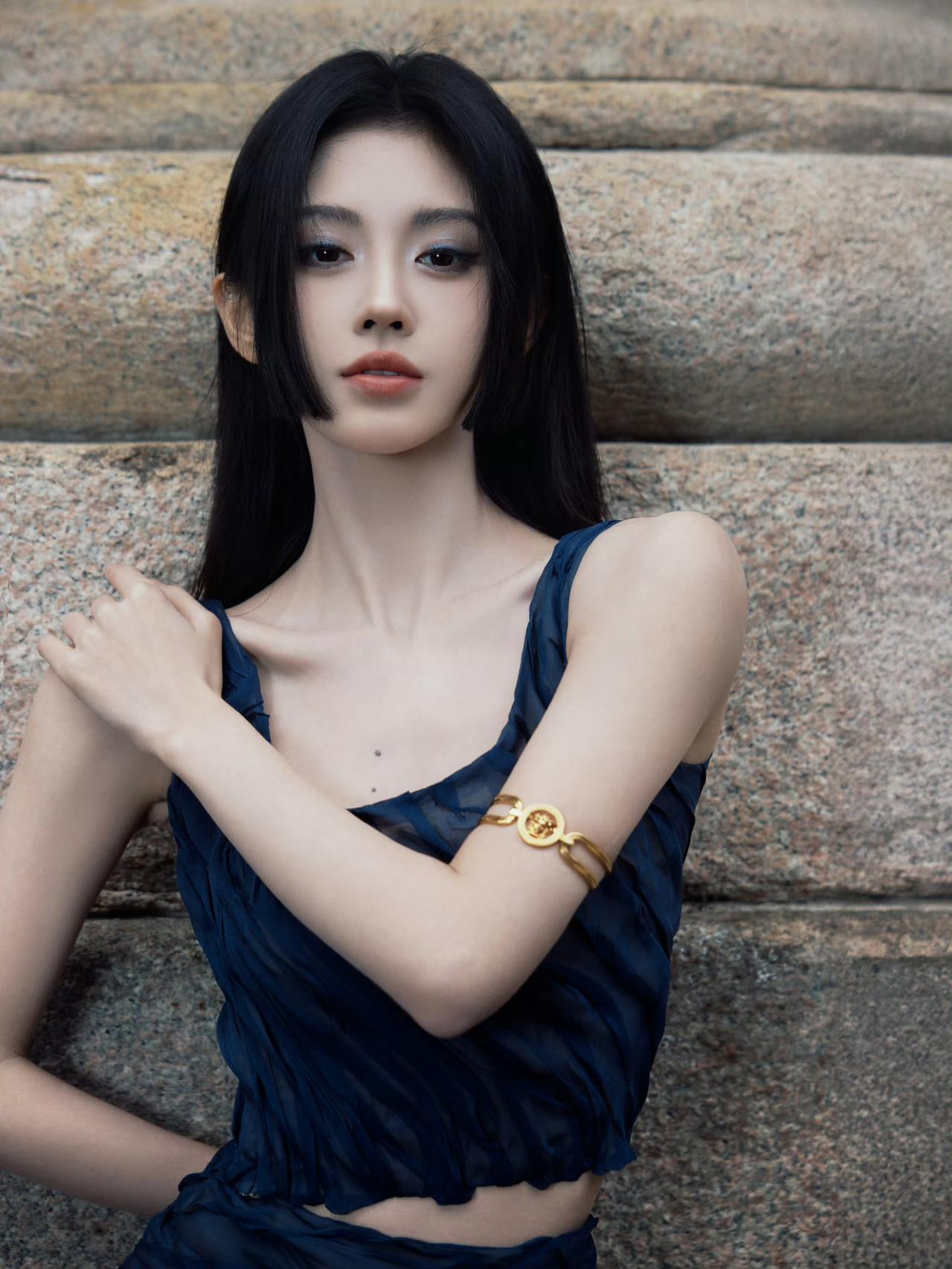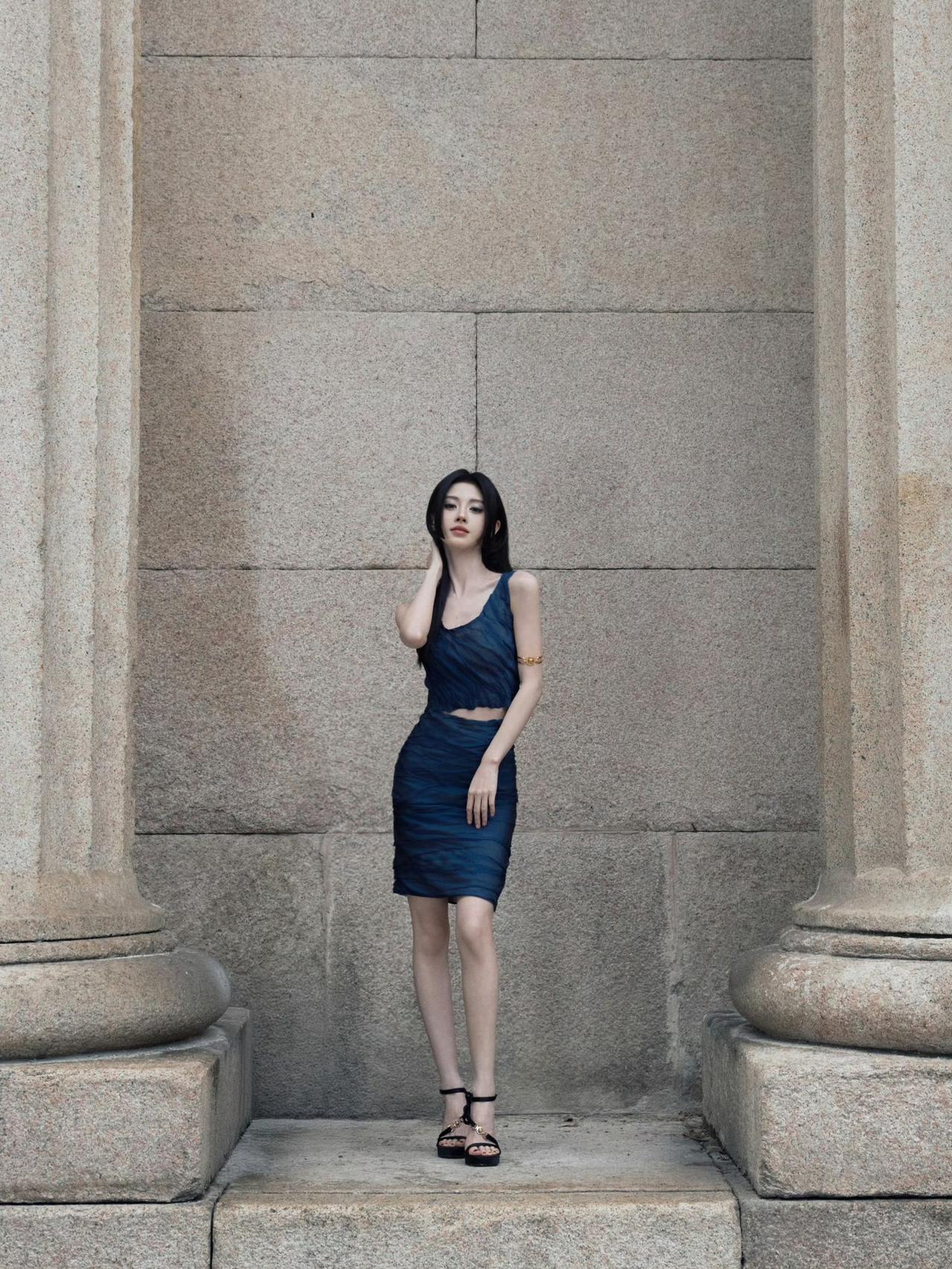 鞠婧祎米兰时装周Versace看秀造型释出,褶质解构的蓝色套装简约优雅,搭配刘海