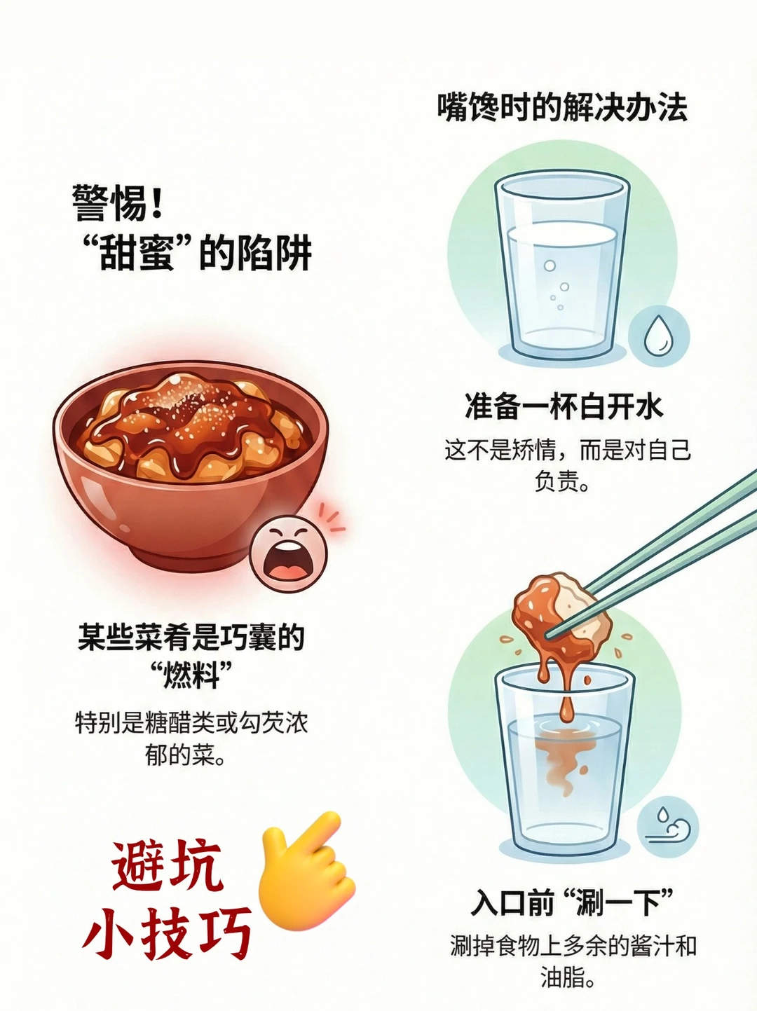 实在想吃怎么办?准备一小杯白开水,涮掉多余的酱汁和油脂再入口。