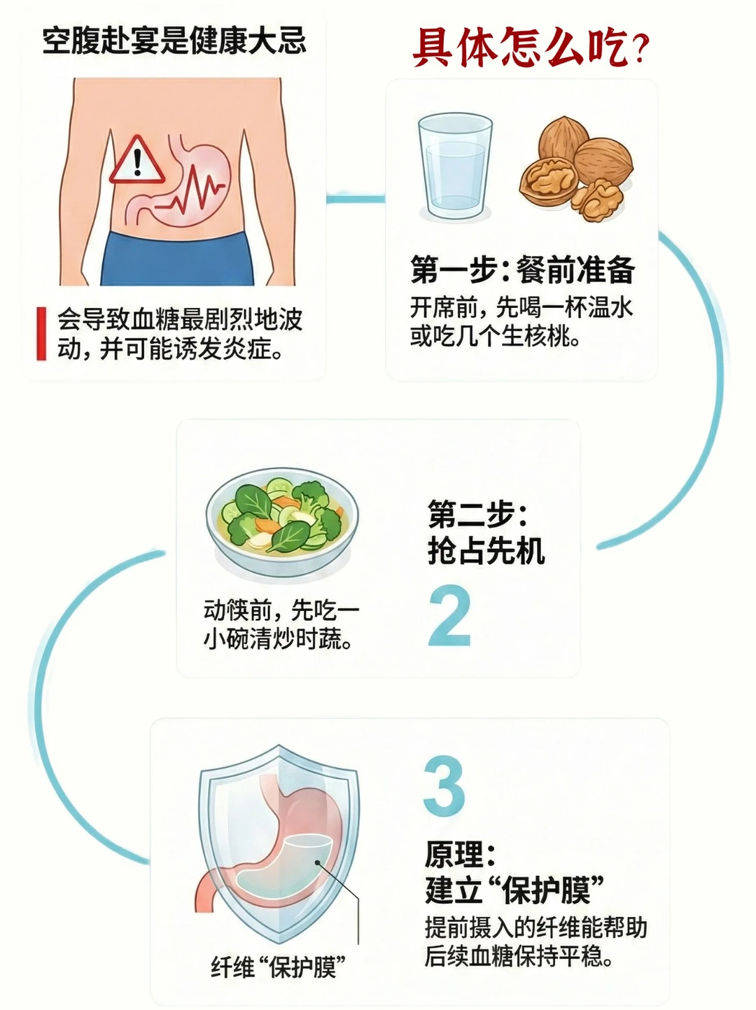 千万不要空腹去赴宴!空腹时血糖波动最剧烈,很容易诱发炎症。