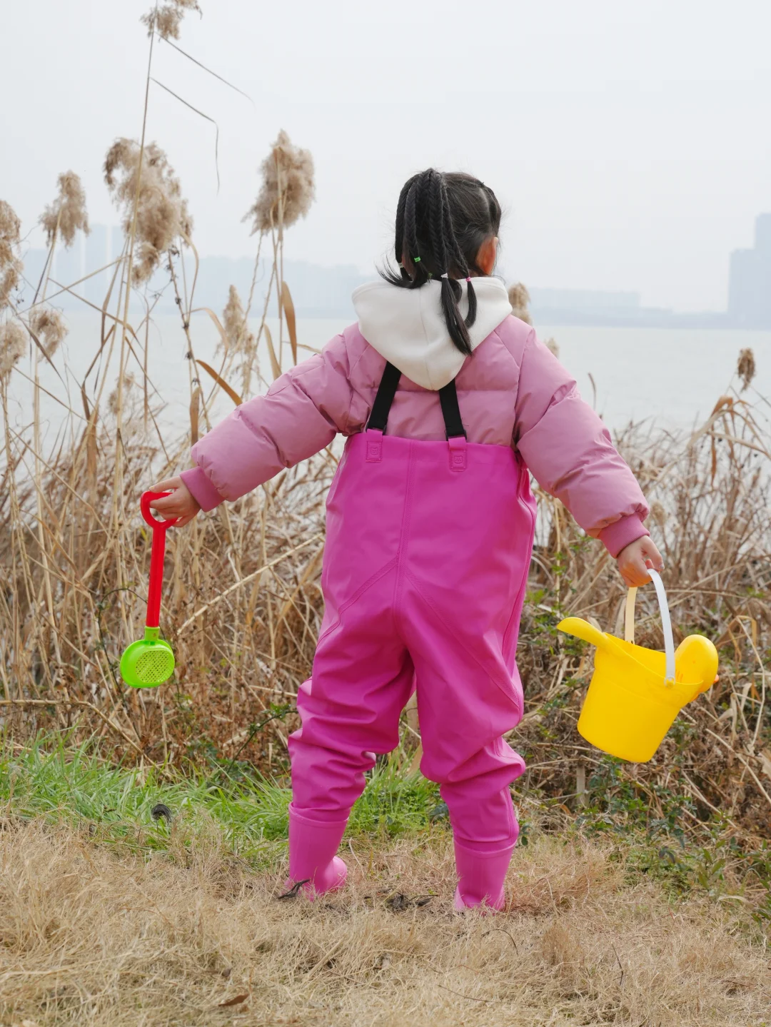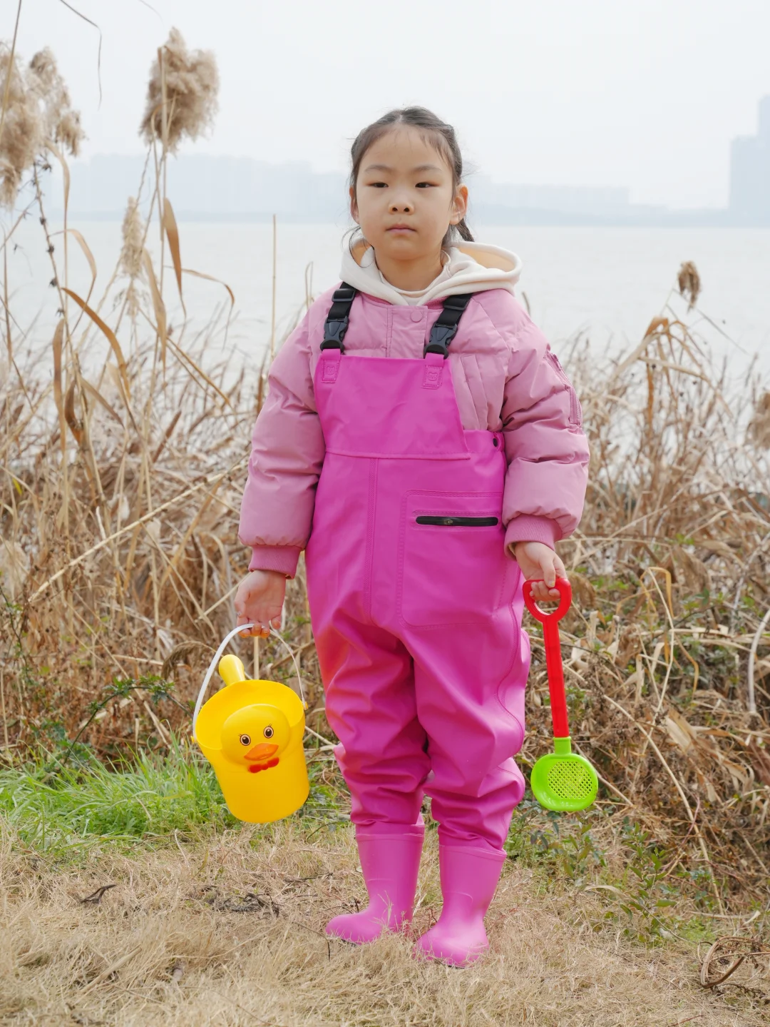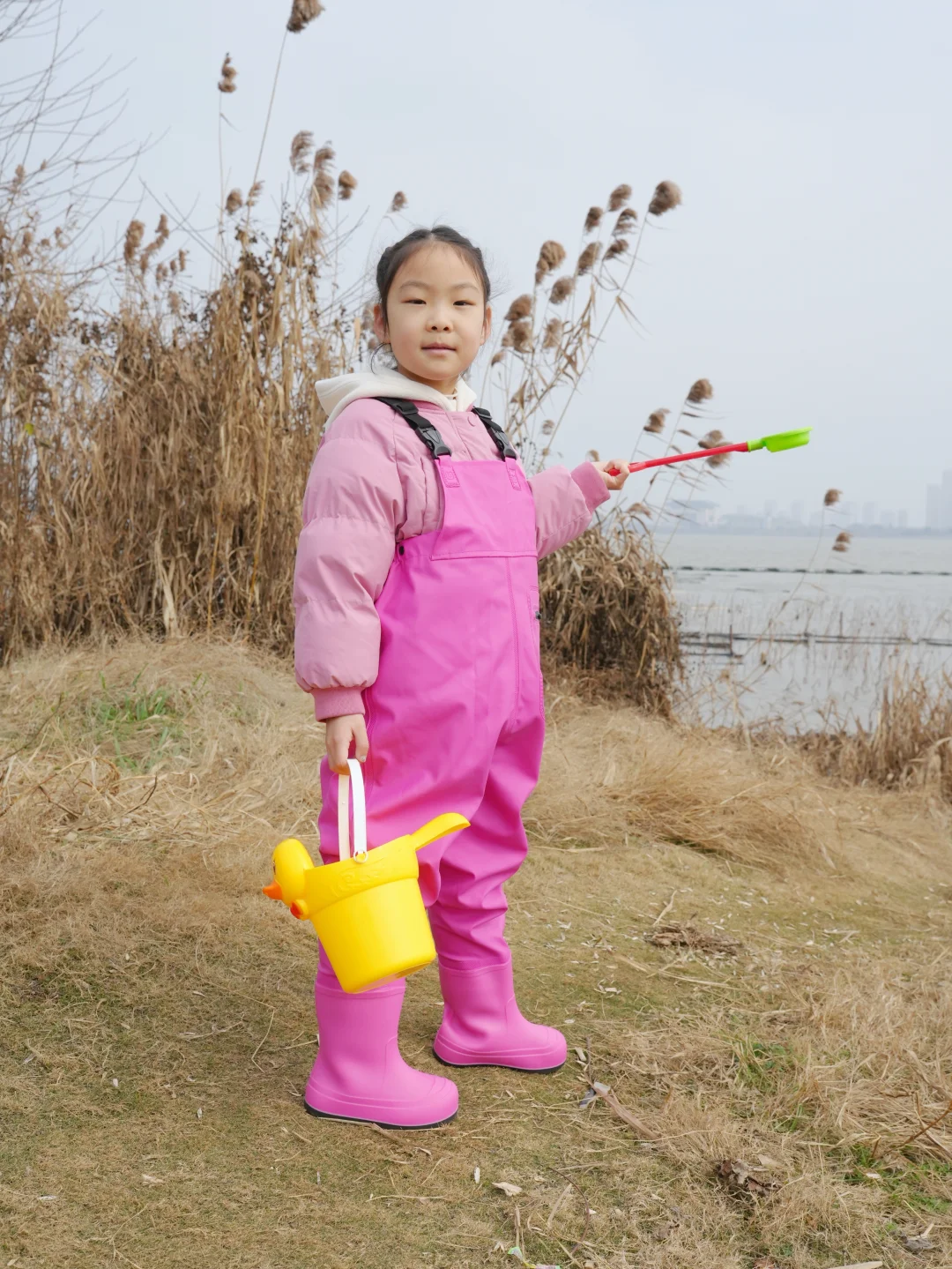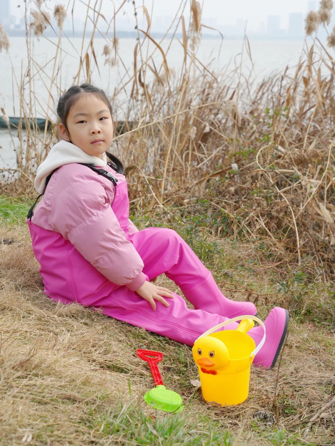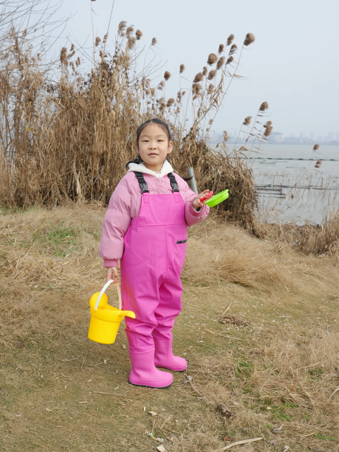 结果刚到湖边——冷风一吹,这位“小勇士”瞬间缩进我怀里:“妈妈…我觉得鱼今天也怕冷…”😅好吧,就知道会这样,但是一定要记录一下,别说这一套挺好看的😊