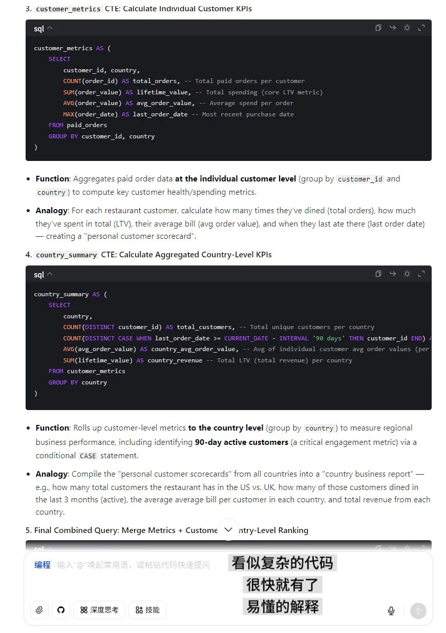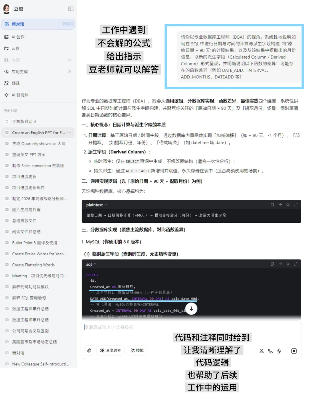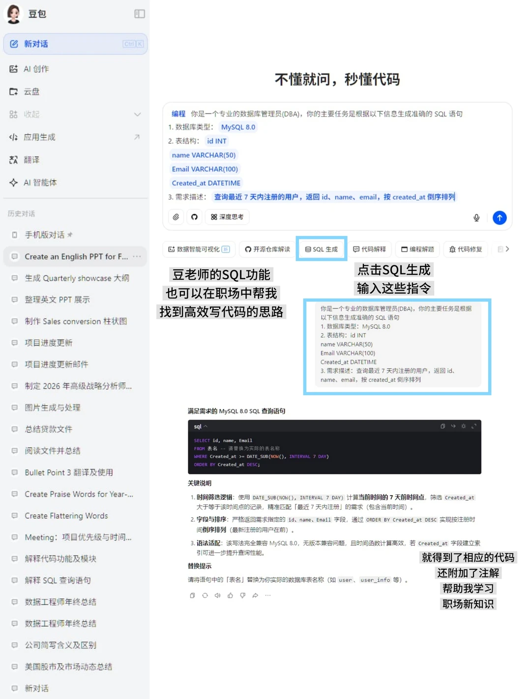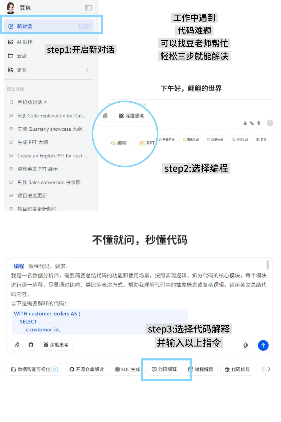 🖥️在职场中想要省时省力,离不开好用的工具🛠️,最近接手了同事的项目,里面包含密密麻麻的代码,如果自己花时间理清逻辑关系,需要几周的时间,想要高效理解,可以借助豆老师的帮助,只需要开启新对话,选择编程,并输入指令”我是一名数据分析师,需要简要总结代码的功能和使用场景,按照实现逻辑,拆分代码的核心模块,每个模块进行逐一解释,通过类比的方式,帮助我理解代码中的复杂逻辑,并生成英文总结。“不一会儿就破解了同事长篇的代码,感觉非常方便,不再需要麻烦同事,同时节省下来的时间用在visibility更高的活上!