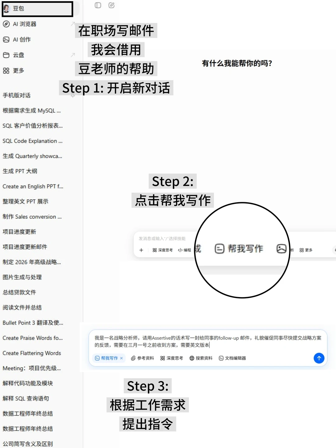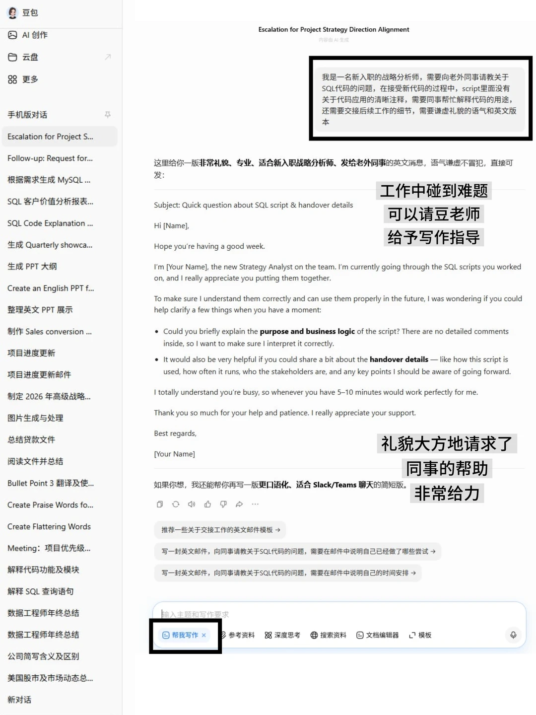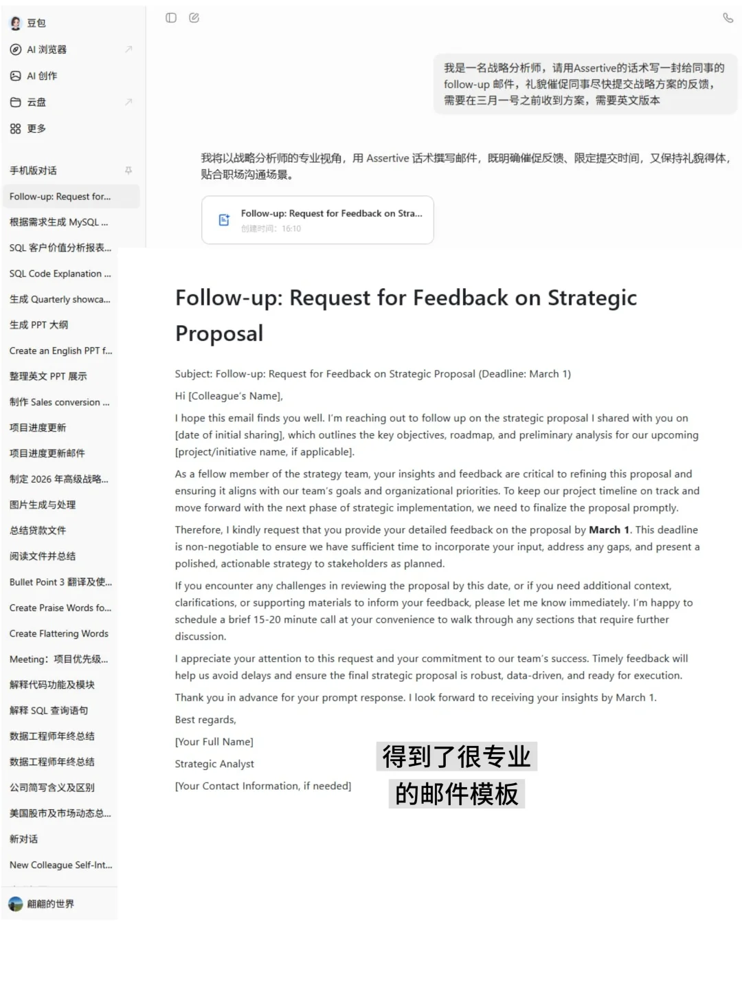 在西方职场讲话的语气很多时候会决定对方的态度,在写邮件发邮件之前,我会请教豆老师的帮助。只需要输入指令:“我是一名战略分析师,请用Assertive的话术写一封给同事的follow-up 邮件,礼貌催促同事尽快提交战略方案的反馈,需要在三月一号之前收到方案,需要英文版本”。很快豆老师就可以起草一封邮件,我感觉豆老师生成的内容不仅专业礼貌,而且能够将要点沟通到位,有了豆老师的帮助,和洋人同事的沟通变得更加简单笃定,提高了英文表达的自信。