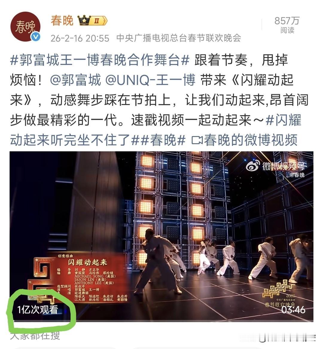 王一博春.晚舞台热.搜8.4亿阅读量。 舞台官.方视频播放量破亿[赞][赞] 近