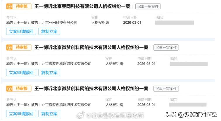 王一博起诉啦!针对此次的构陷造谣,北京星权律师已于3月1日将微博用户“ik ***_O”(UID:847****843)、微博用户“小弟**_”(UID:777****759)、豆瓣用户“爱**”(豆瓣ID:214***299)等起诉至法院,现已完成立案材料的递交工作。