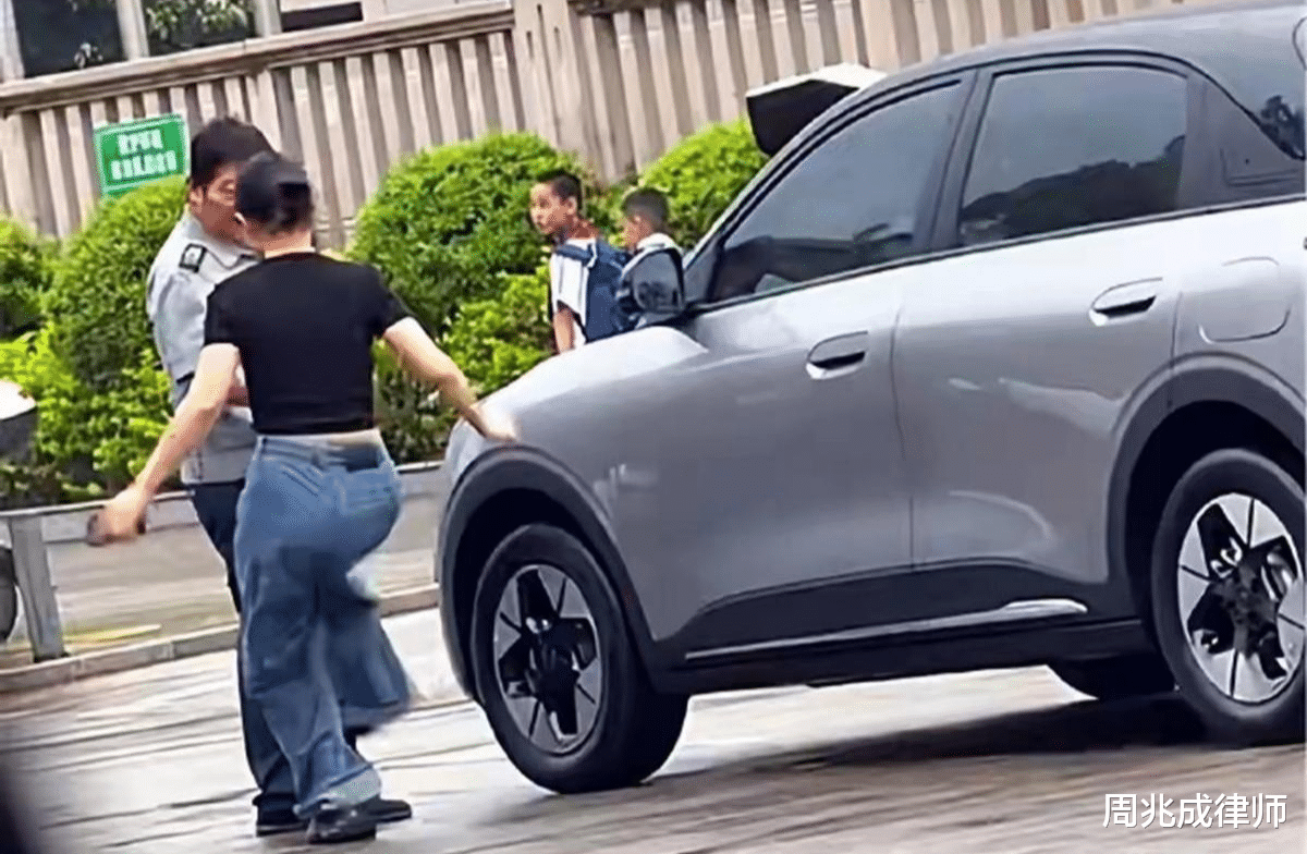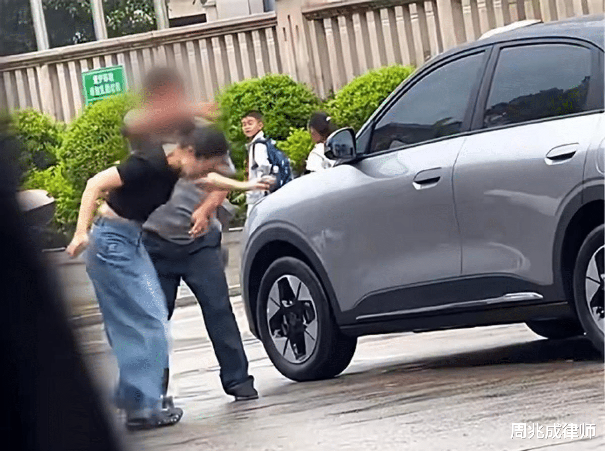 女子送孩子上学,在禁停区停车,学校保安上前劝离,双方因此发生争执,女子情绪激动地下车,一脚踹向保安,保安也不惯着,反手就