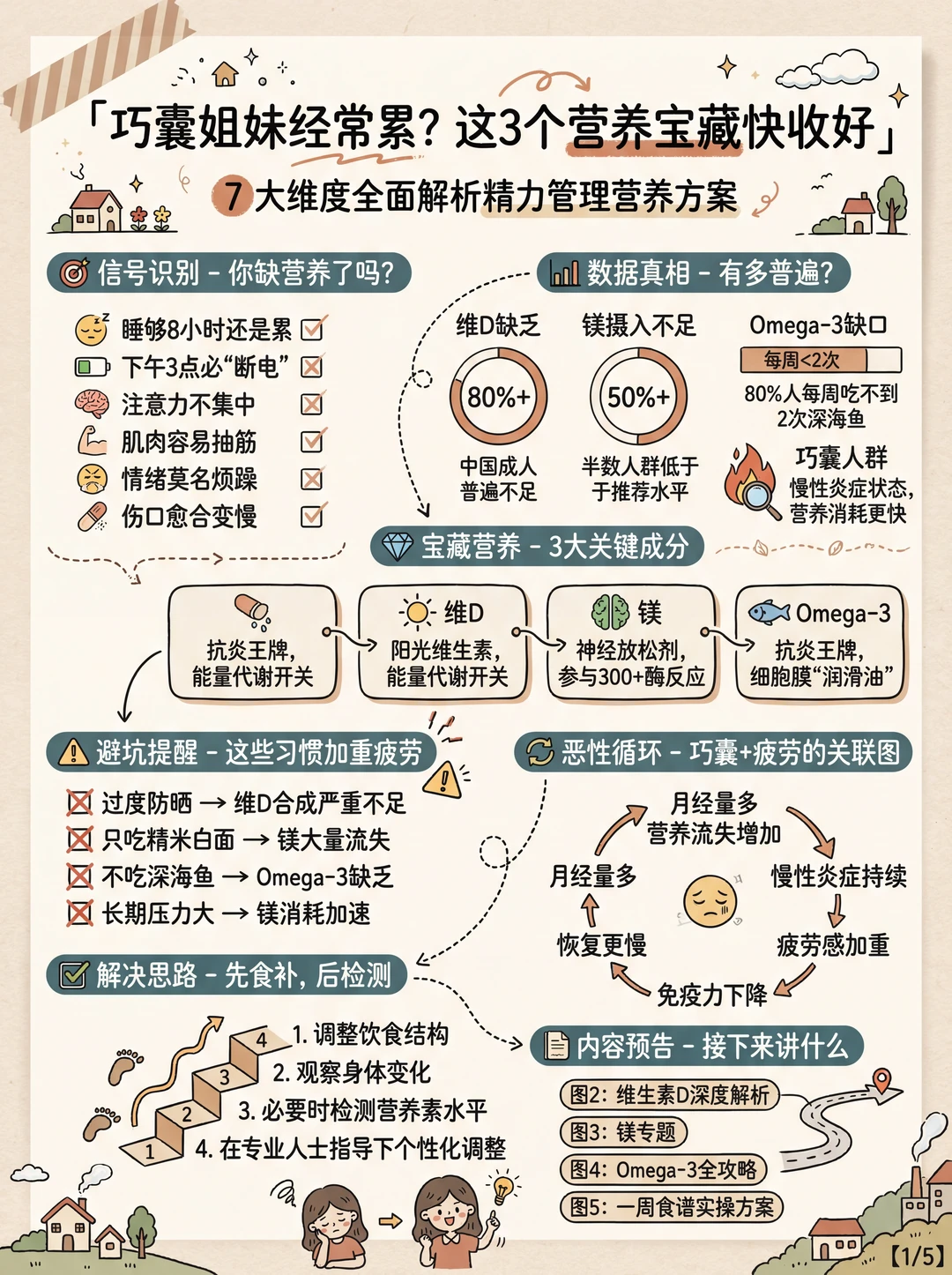 你发现没,这3个营养素有一个共同点:在现代饮食结构里都很容易摄入不足,而且缺乏的早期表现都很"日常",就是那种说不清楚的疲惫感。