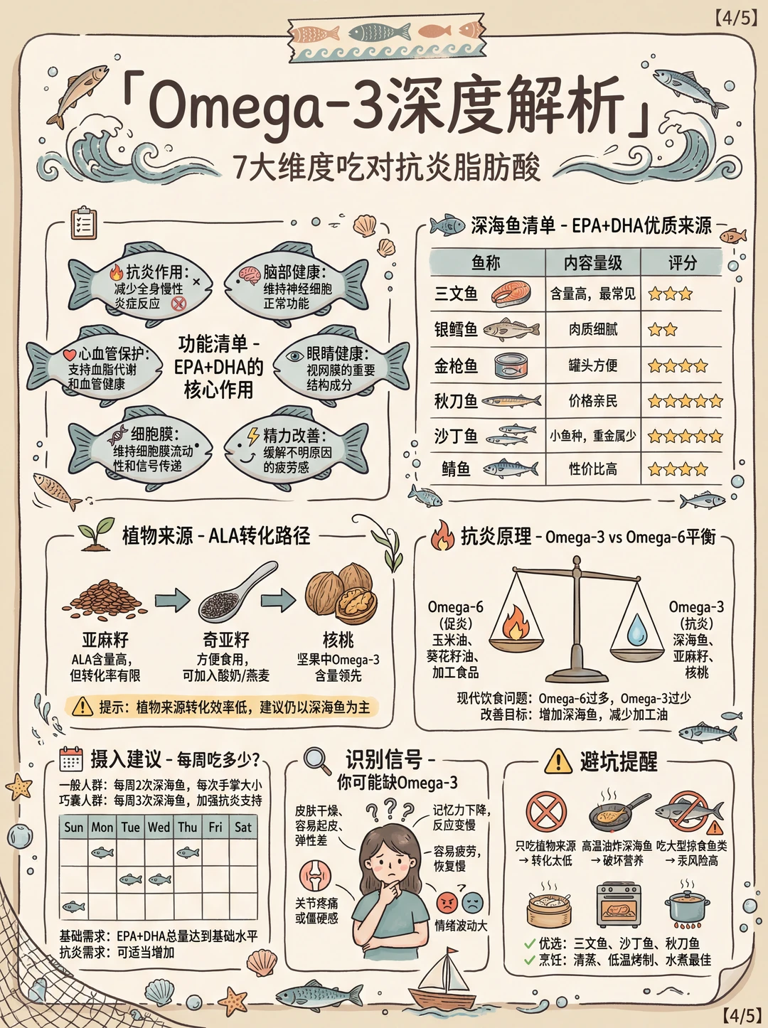 三文鱼、鲭鱼、沙丁鱼——深海脂肪鱼是EPA/DHA最直接的来源