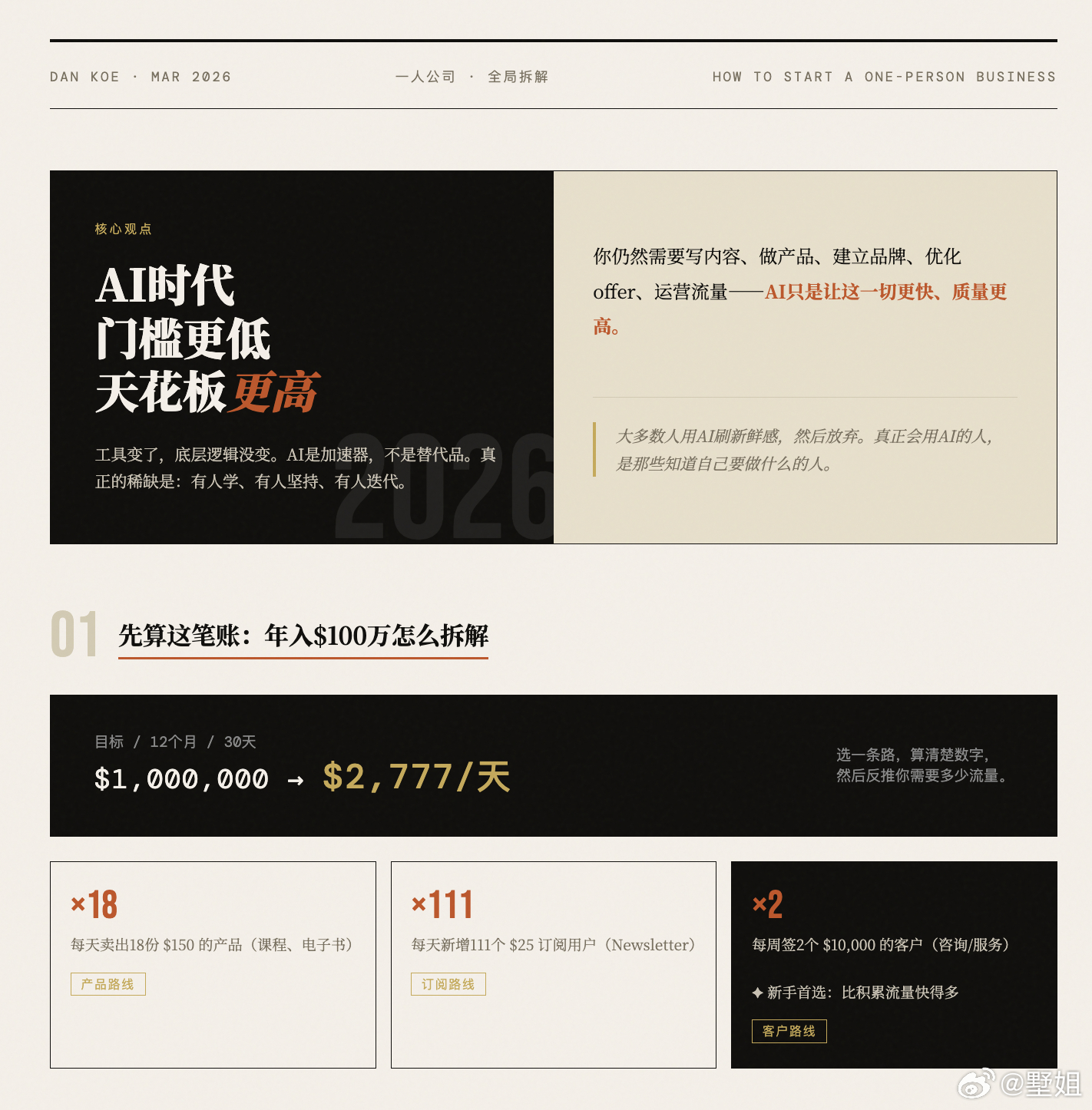 在人人都有 AI 的时代,一个人如何做出年入百万美元的生意?时代变了,但底层逻辑没变。AI浪潮之下,创业的门槛降低了,但天花板却更高了。