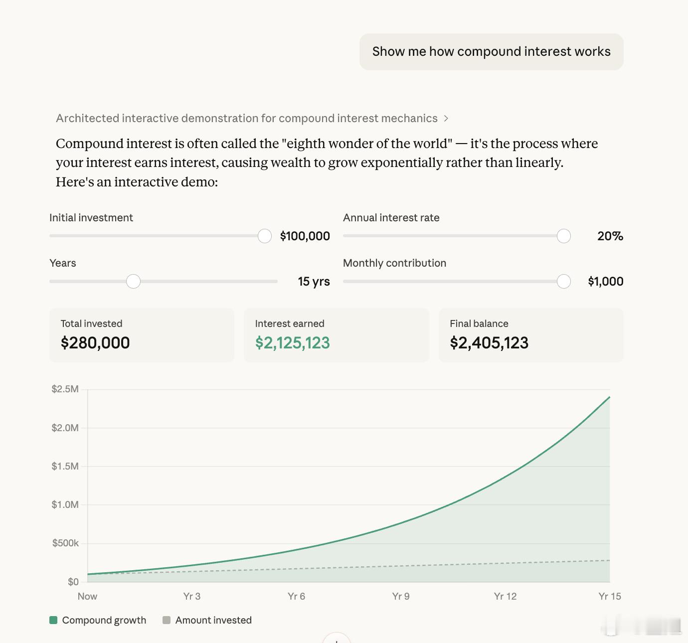 我今天看了Claude能在对话框里做可视化互动后,更是这个感觉。如图,我说个show me how compound interest works,1分钟不到就帮我做出能互动的可视化图。(图1 图2)