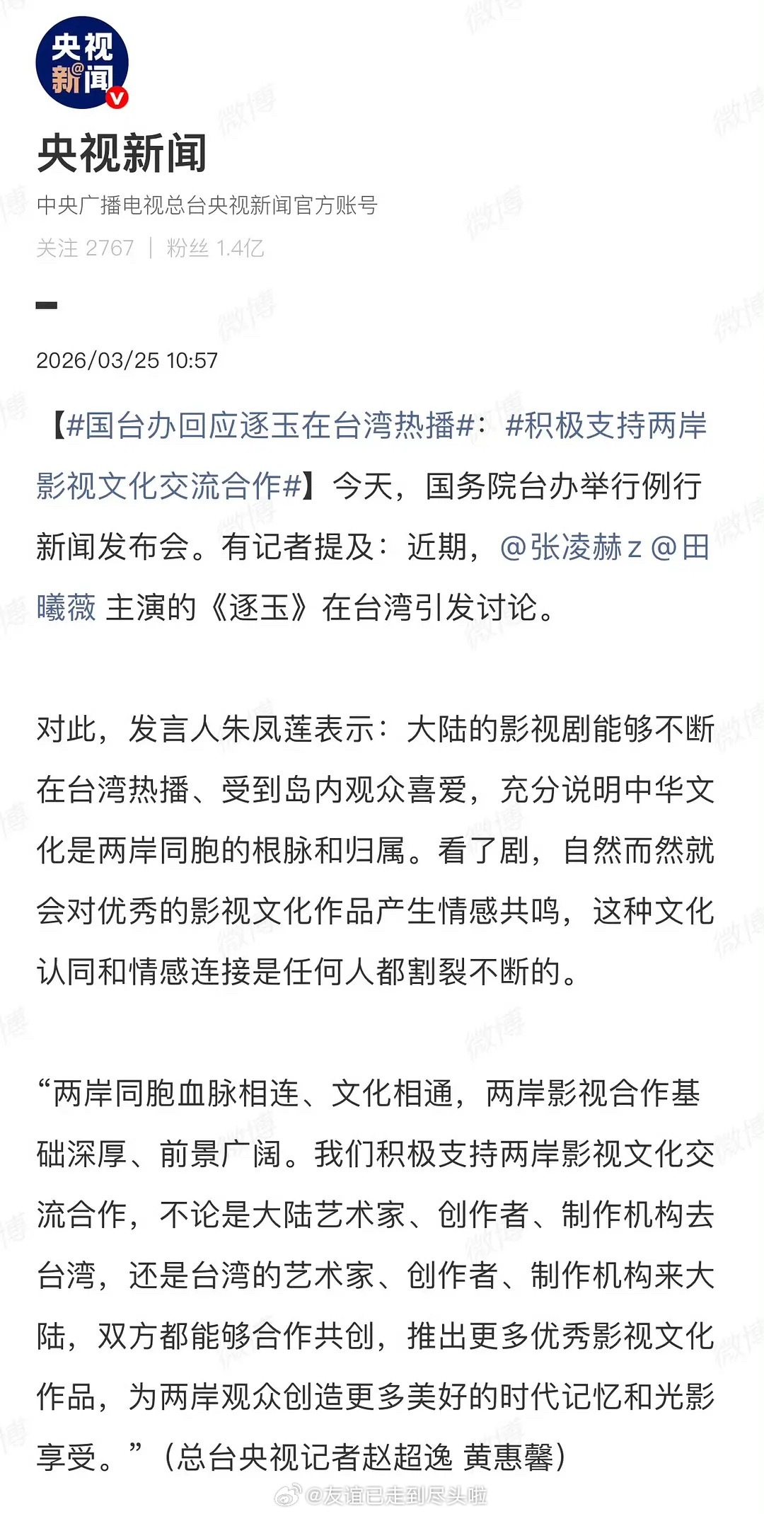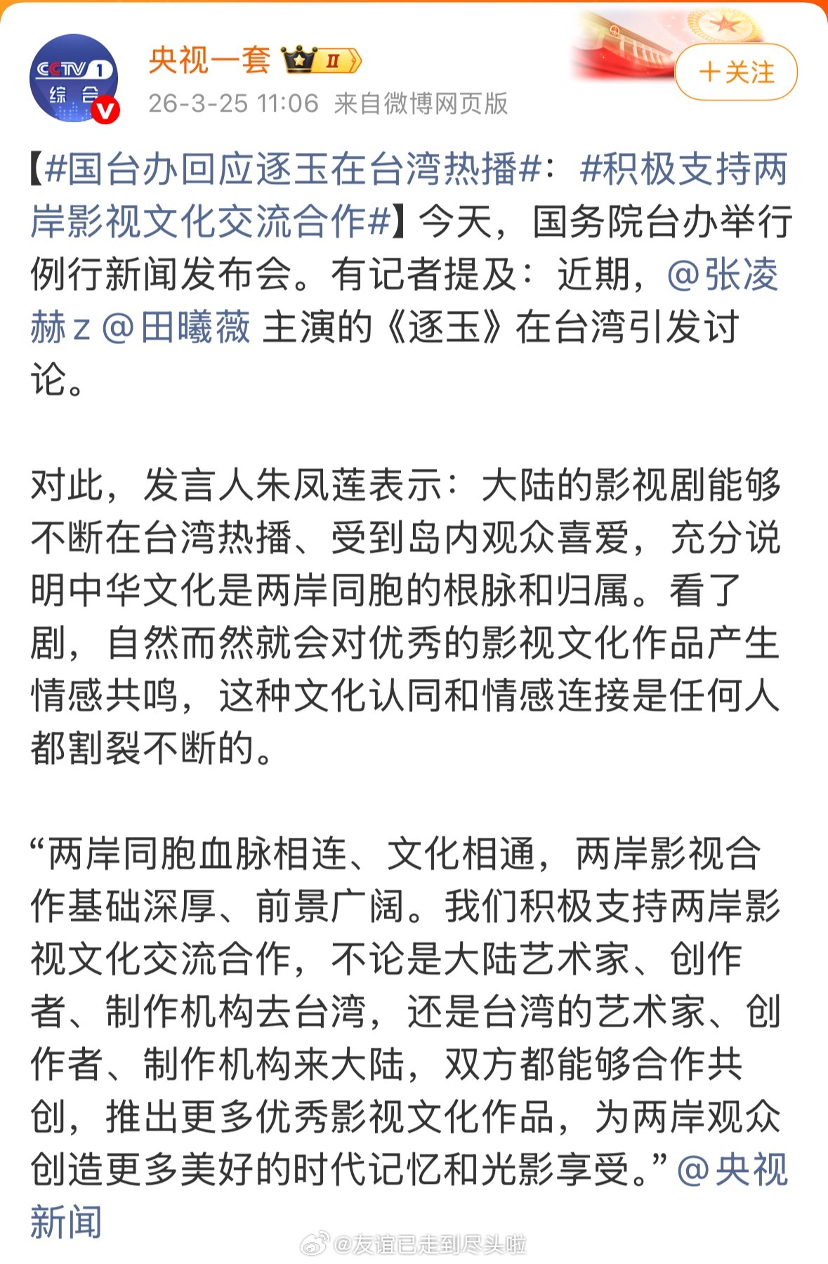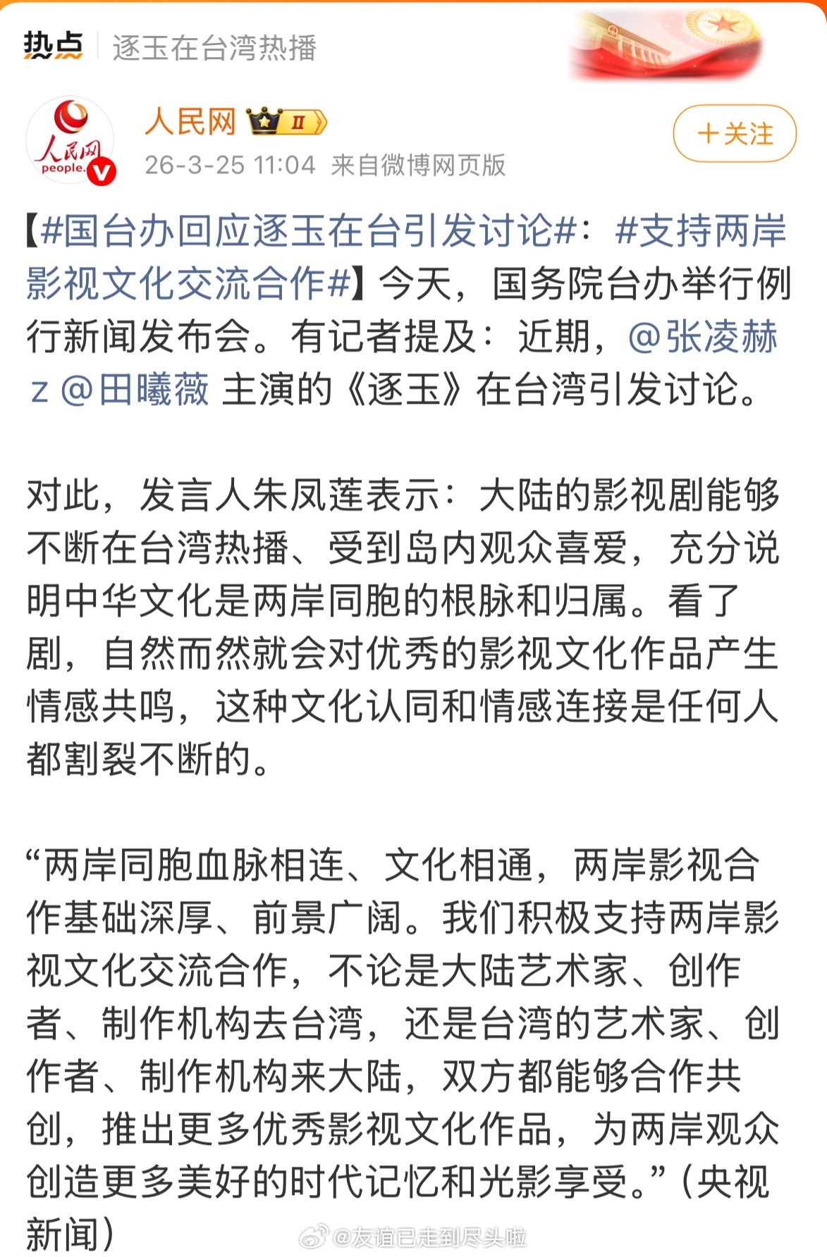 有人关注吗?张凌赫和田曦薇的逐玉 在台湾热播这件事,好几个官媒报道了10家官媒背书的含金量是多少?国台办回应逐玉在台湾热播