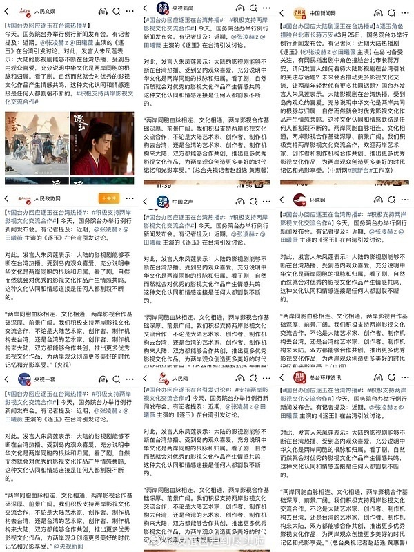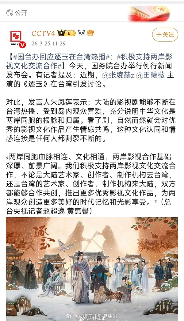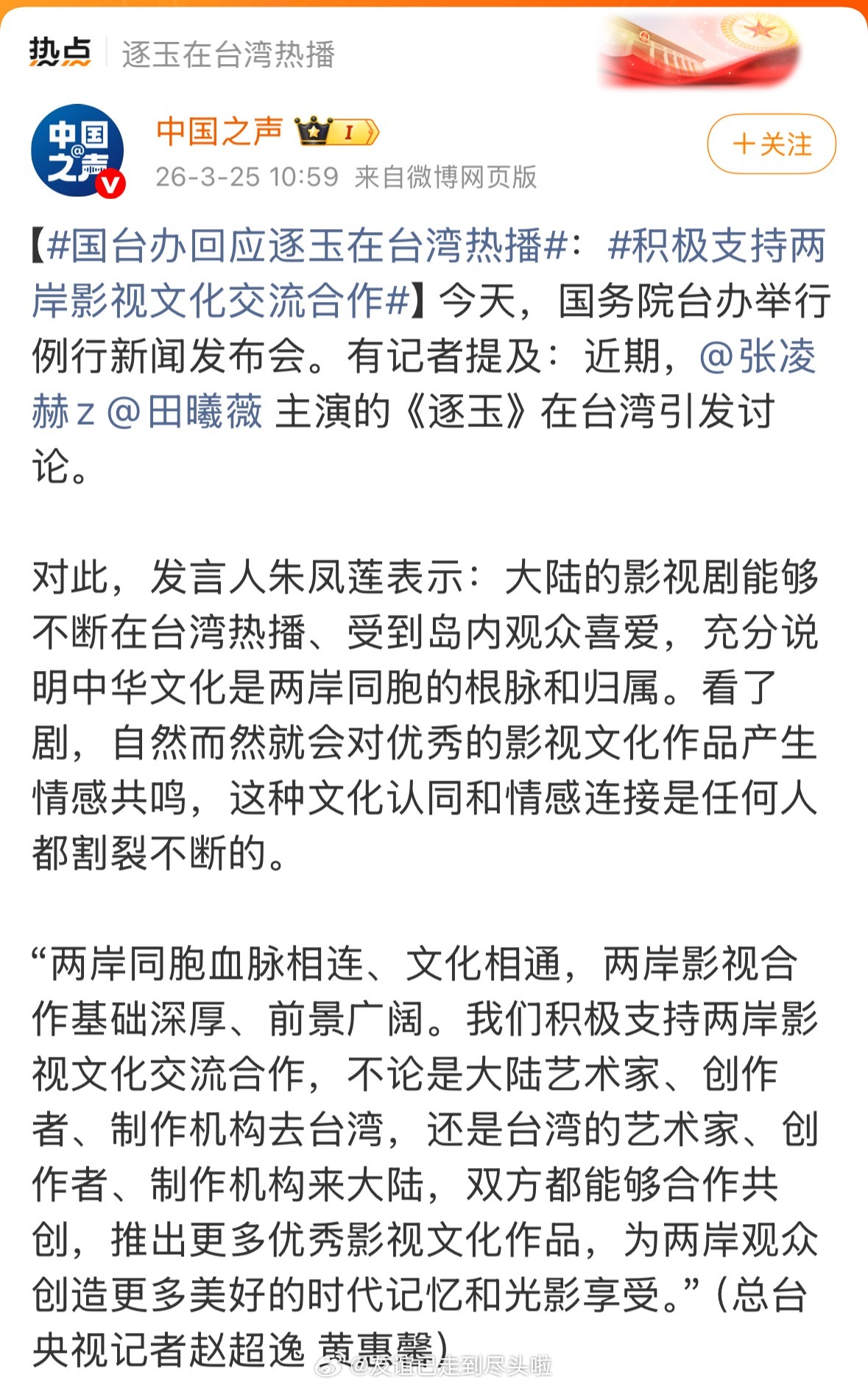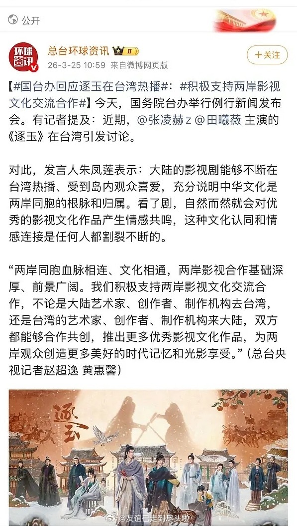 有人关注吗?张凌赫和田曦薇的逐玉 在台湾热播这件事,好几个官媒报道了10家官媒背书的含金量是多少?国台办回应逐玉在台湾热播